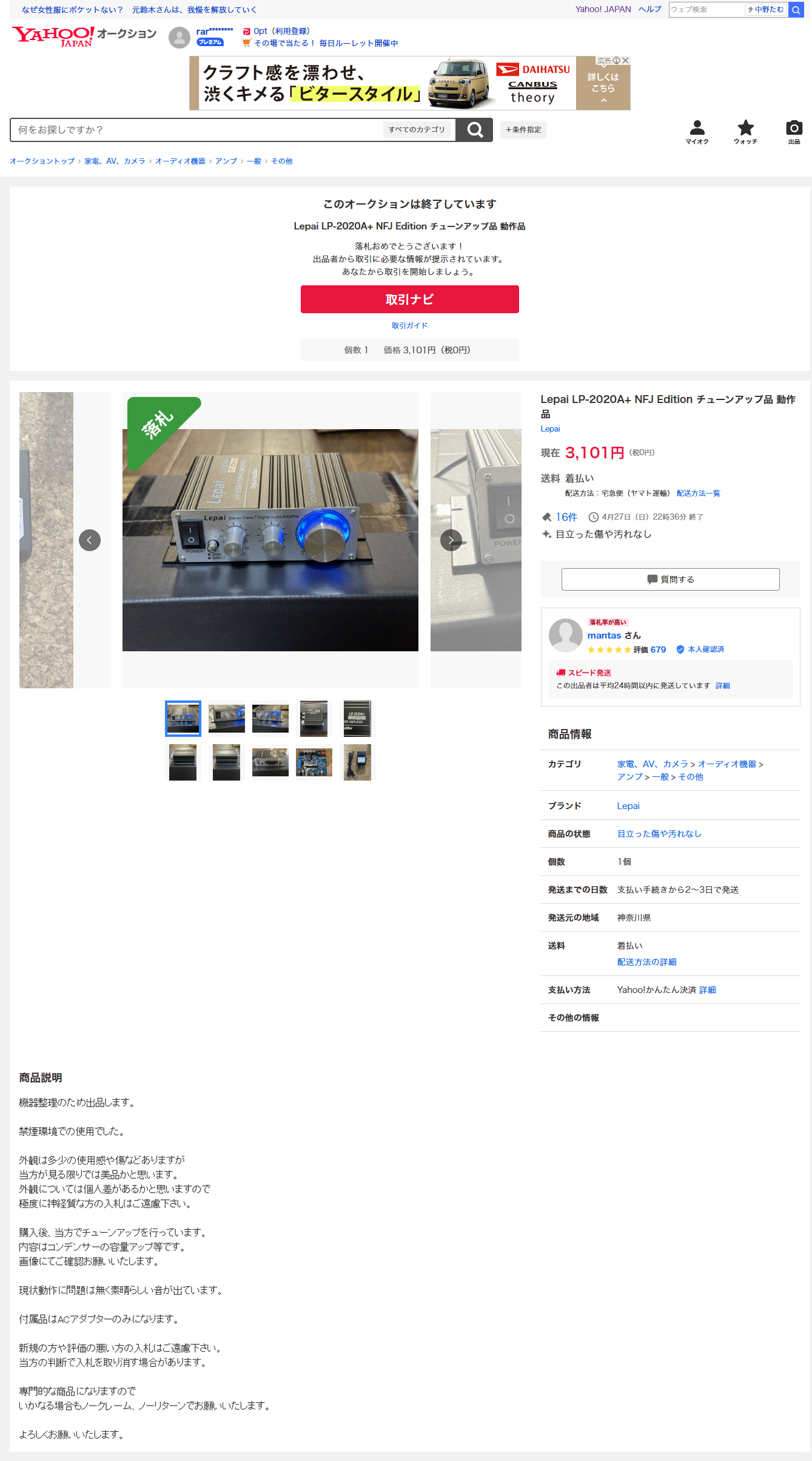 実は上で紹介したLepai LP-2020A+ NFJ Edition チューンナップ品を入札する際に、図らずも終了日が同日であったこの物件の入札も視野に入れていました。