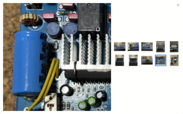 まず大きく目を引くのは、基板の左端に見える一際大きくライトブルーが目にも鮮やかな電源部の大容量(たぶん)平滑コンデンサです。