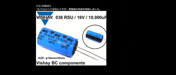 Vishay/BC Components038 RSU(10,000μF)ですが、038 RSU は旧フィリップス時代からも標準のオーディオ機器で採用実績のあるコンデンサだそうです。