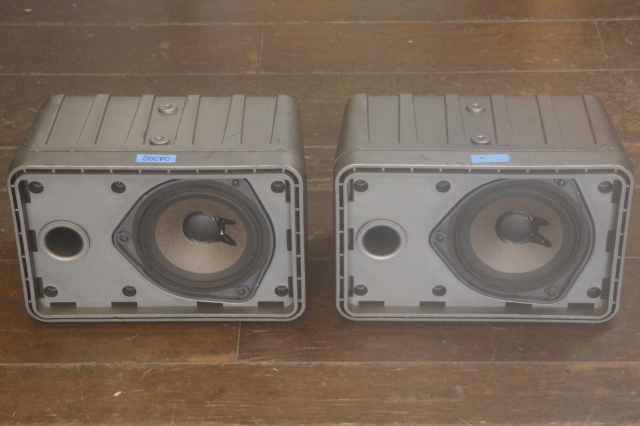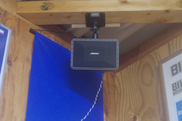 そしてスピーカーケーブルのBOSE 101VMスピーカー本体裏側のスピーカー入力バネ式端子への接続も終わり、ケーブルのガレージ壁等への引き回しと固定作業も終了したときの様子を撮影したのが左の画像です。