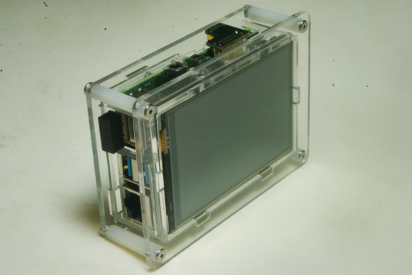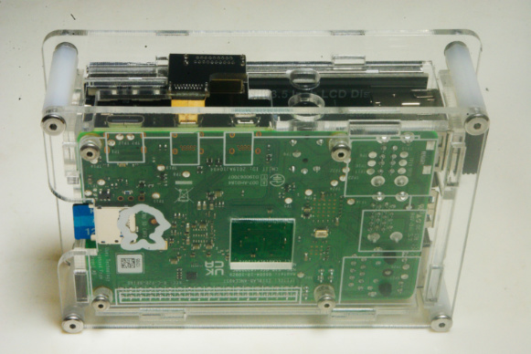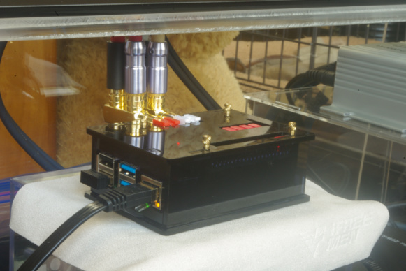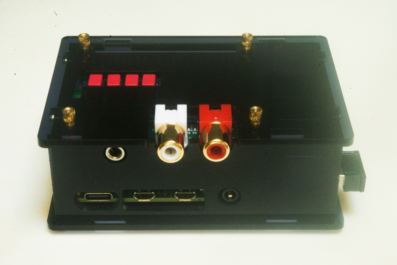 Raspberry Pi 4 model B + inno HIFI DAC module I2S インターフェース ネットストリーム オーディオ プレーヤー を、まさにそのフォルムから格納されている内容物のパフォーマンスが推察されるような美しい機能的な黒色半透明の所謂ダークスモークカラーの、ただアクリルパネルを組み合わせただけのシンプルかつとても美しいその中に収まる
