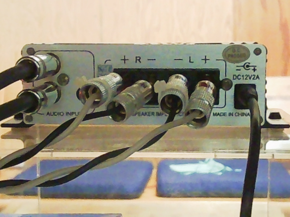そしてこれはパワーアンプ交換後のLepai LP-2020A+ NFJ Edition Lot.6の背面ですが、例のNakamichi?製バネ式端子用スピーカーケーブルプラグのカバーに、+-接触防止用のインシュロックが着けられています。