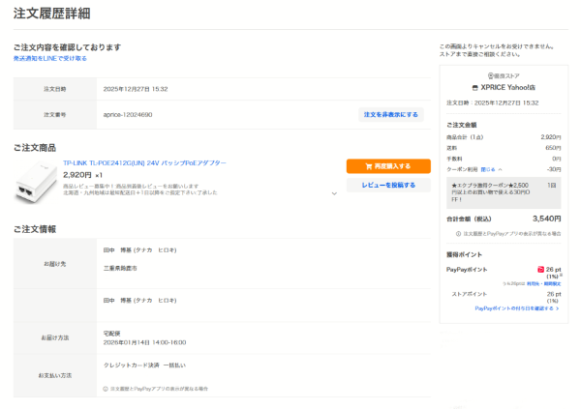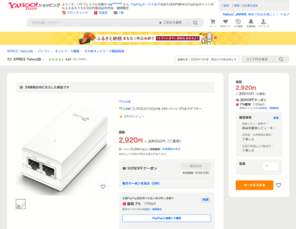 購入後に購入ページの仕様をよく読んだら、そこにPoE給電アダプターが付属されていることが確認出来ました。