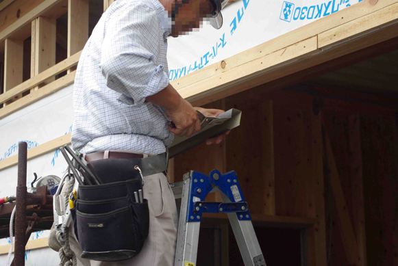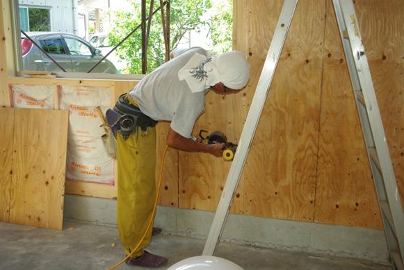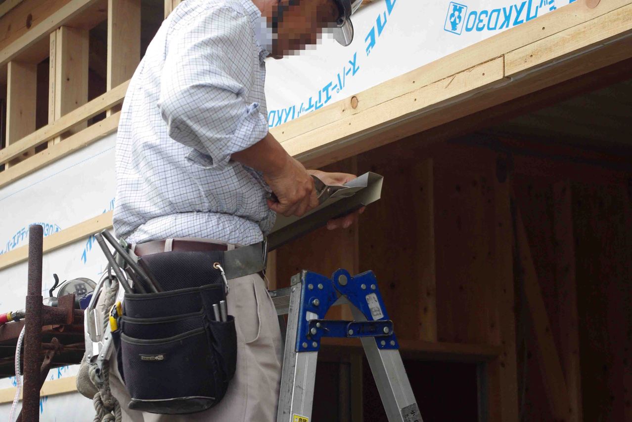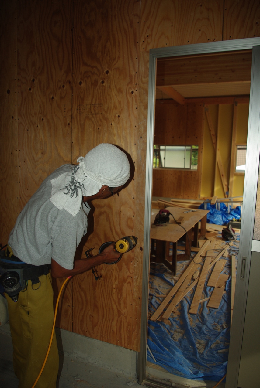 この大工さんは、一昨日に引き続いて残った部分にコンパネの打ち付けを行っていきました。