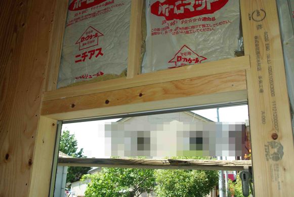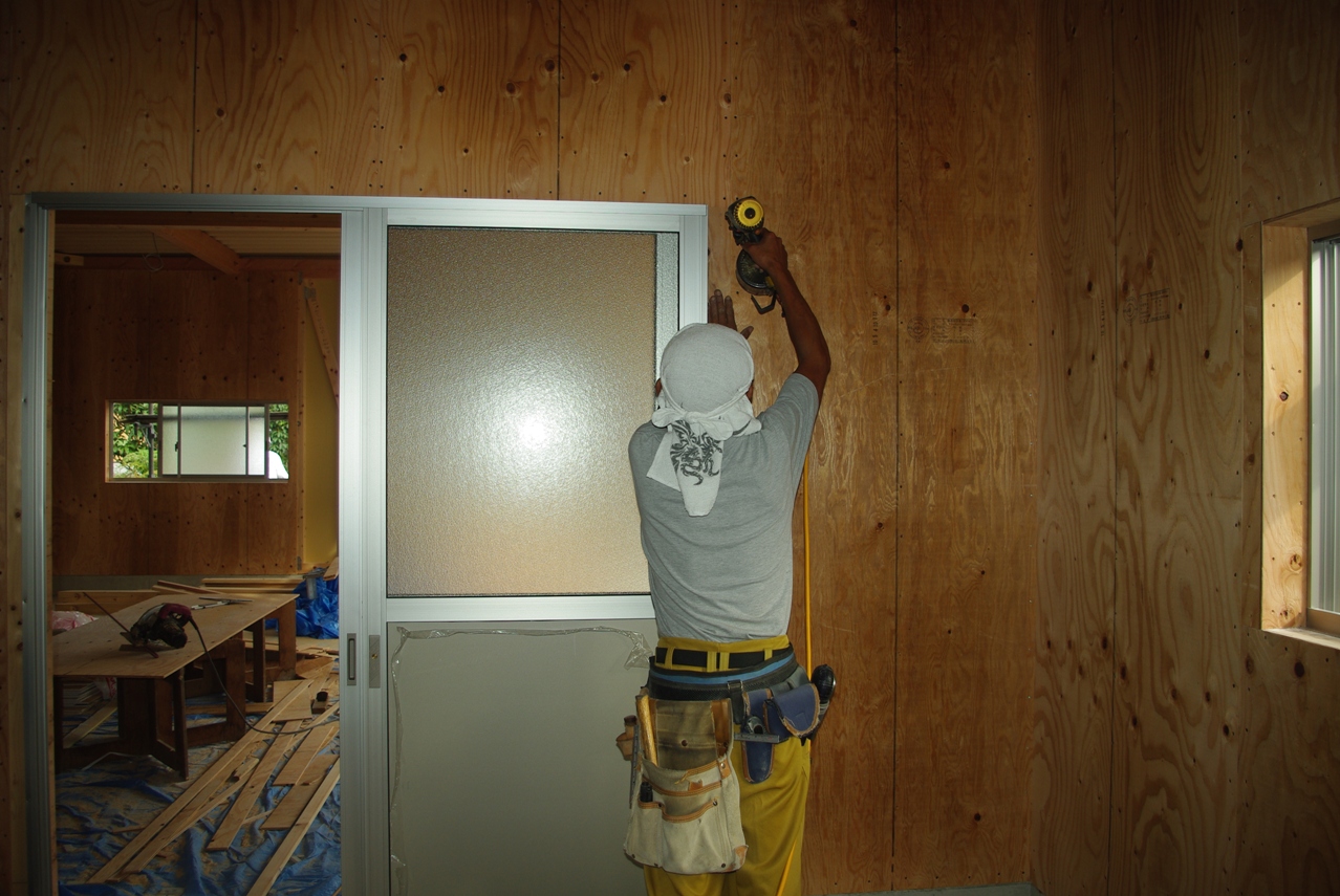 コンパネとアルミサッシ枠との隙間を、やはりコンパネの端切れを打ち込んで埋めていきます。