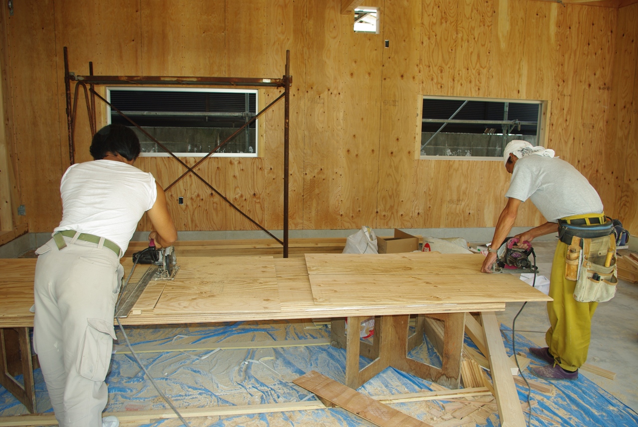 仲良くお二人の大工さんが、コンパネの切り出しを行っています。