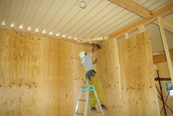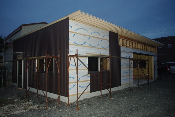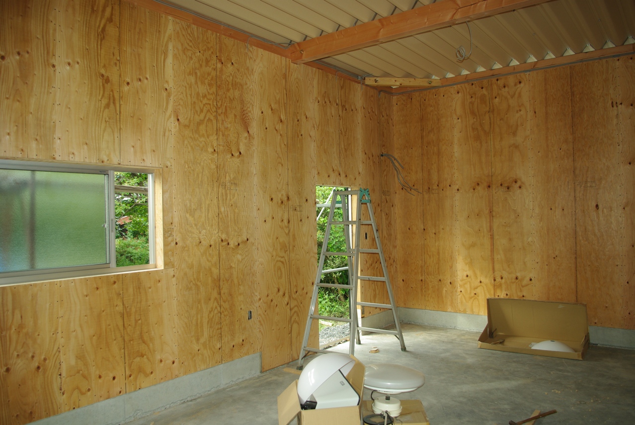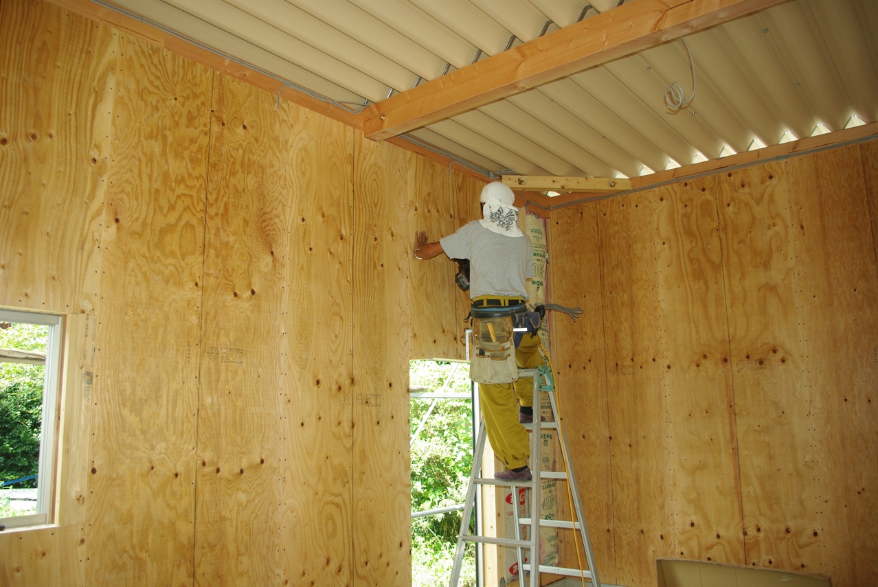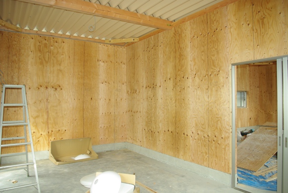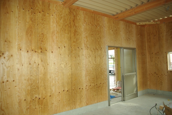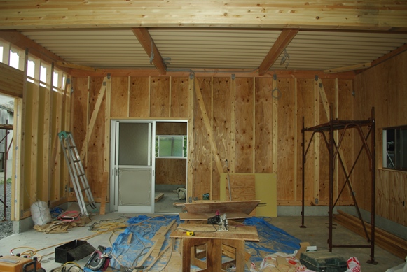 倉庫内壁のコンパネ打ち付けがほぼ終わりました。