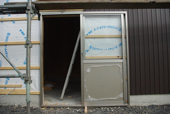 倉庫入り口の引き戸アルミサッシの枠に合わせた周囲の造作がまだ続いていました。
