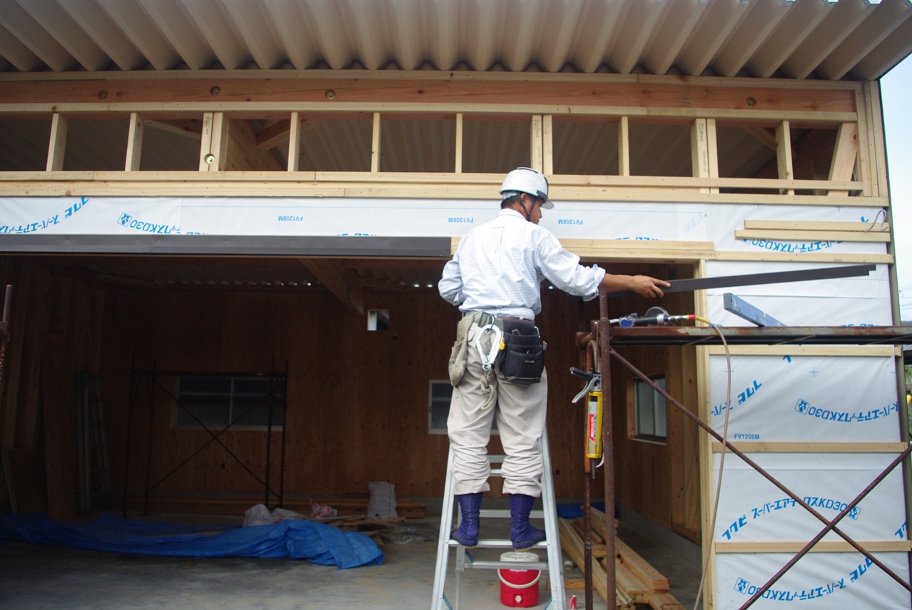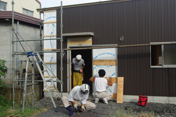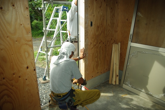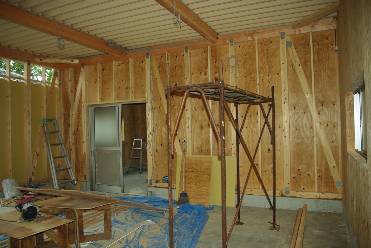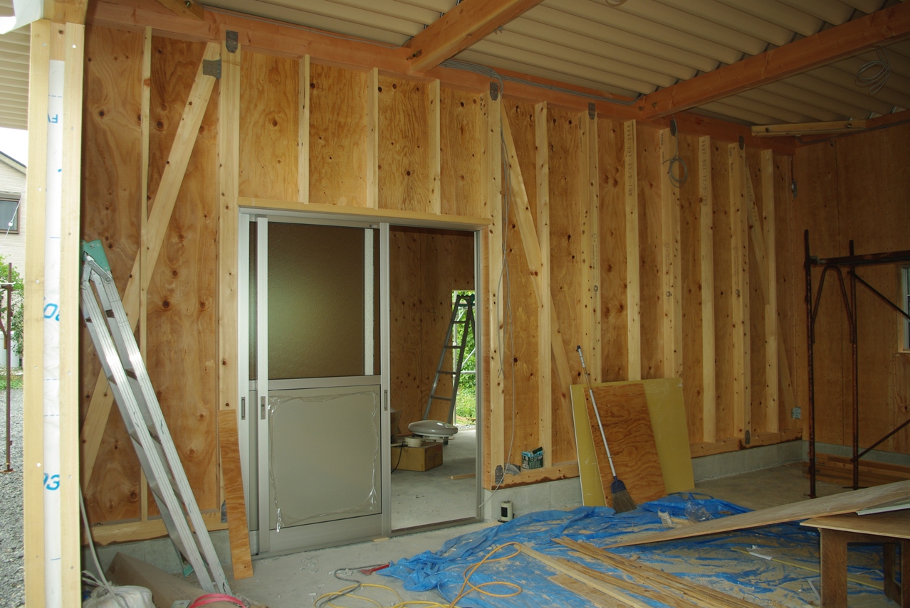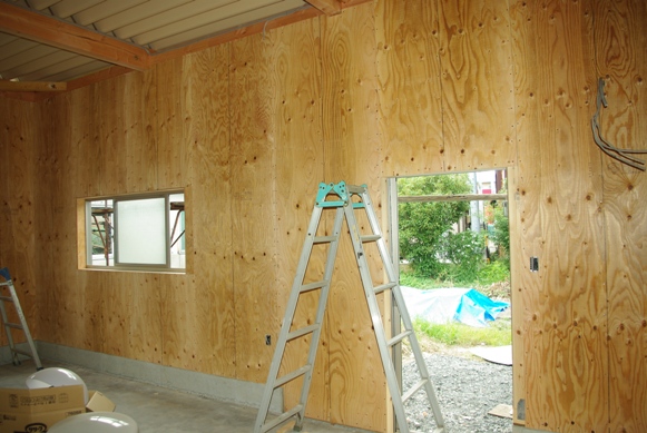 本日の午前中は大工さんがお二人で主に内壁のコンパネを貼り残した部分と、倉庫の入り口の造作を行いました。
