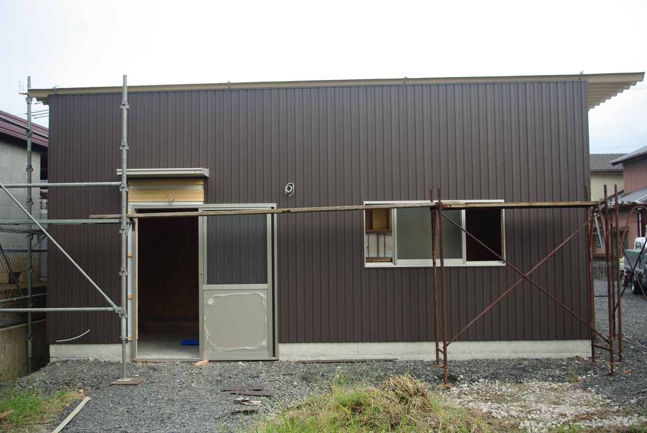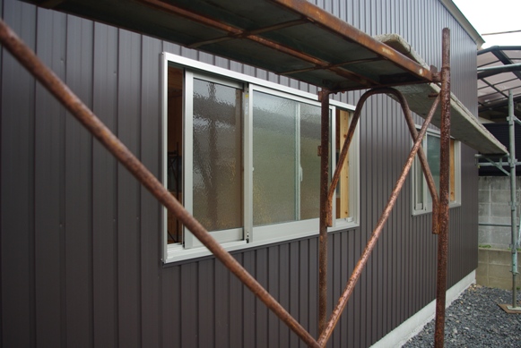 倉庫の入り口付近の造作を外から見ると、戸袋の部分のトタン板の胴縁がまだ修正されていません。