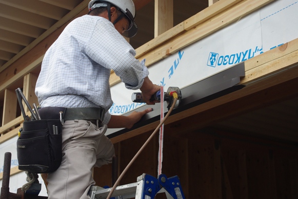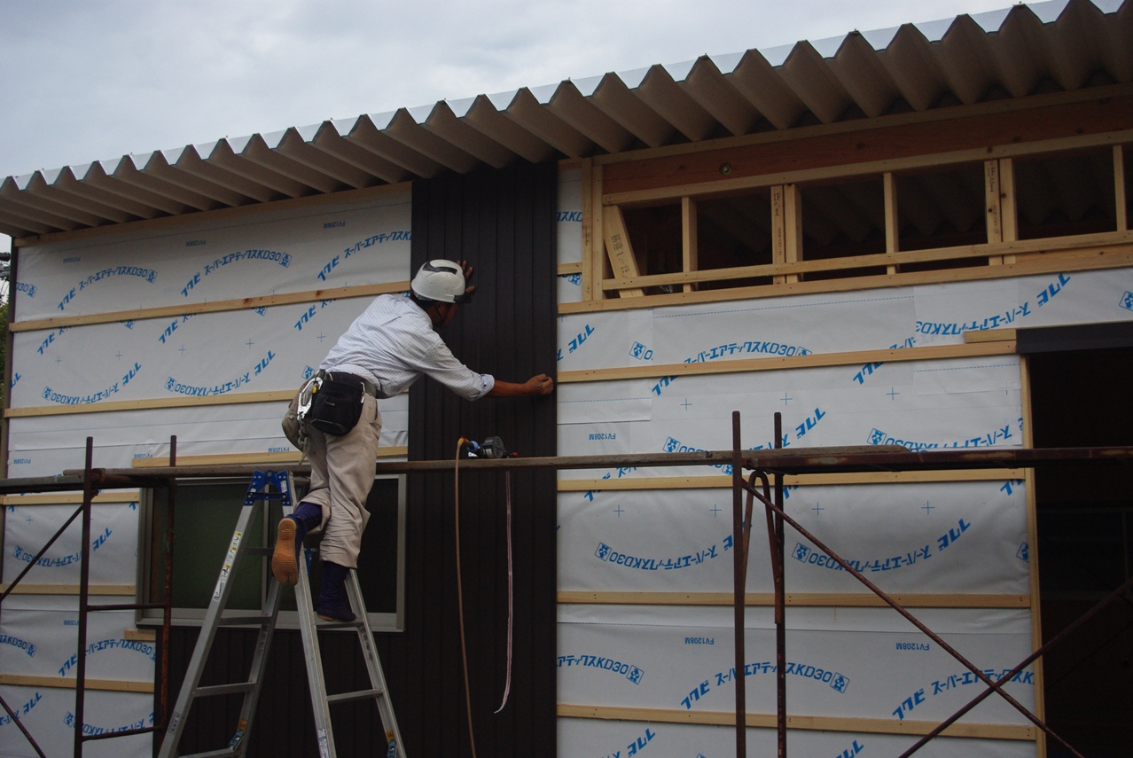 その後板金屋さんは、一昨日やり残したこの西側外壁のトタン板の打ち付け作業を行いました。