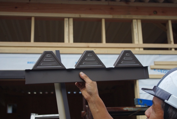 これは折版屋根と梁の隙間を塞ぐためのものですが、完全に塞いでしまうと天井部分の空気がよどむので、換気をスムーズにするスリット入りのものにしました。