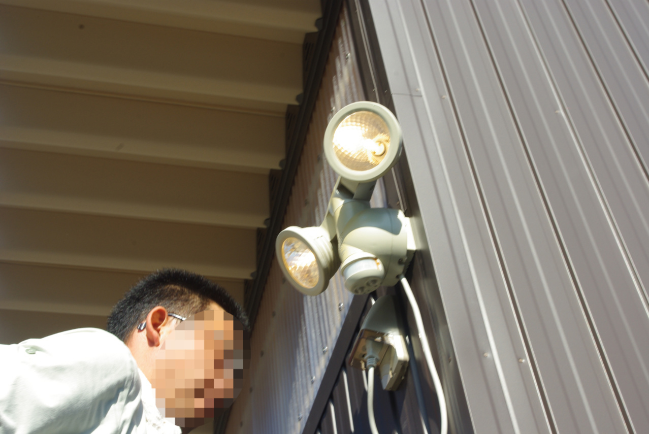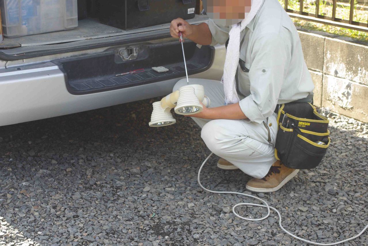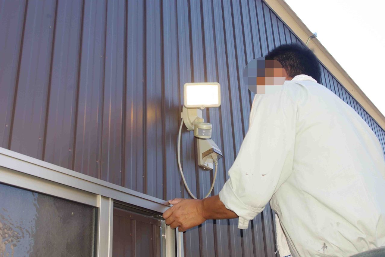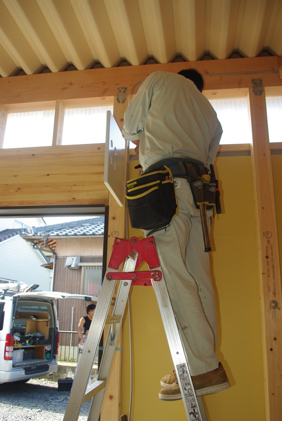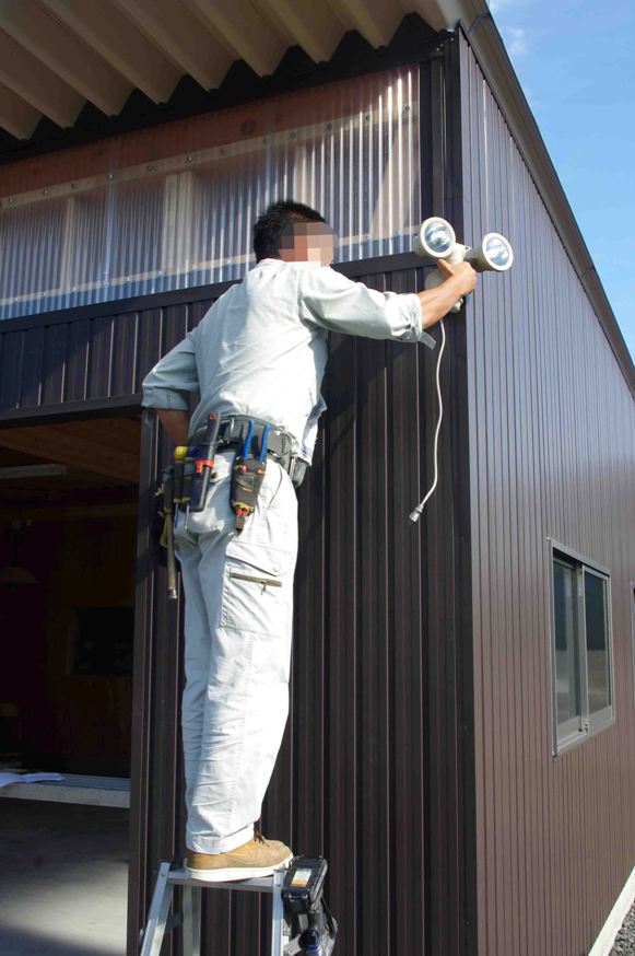 本日は電気屋さんもみえて、電動シャッター用の配線と以前から依頼してあったセンサーライトを取り付けにみえました。