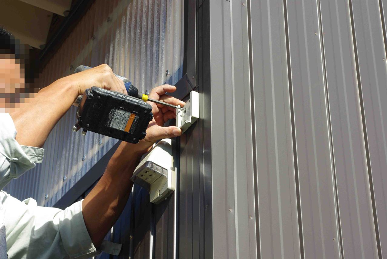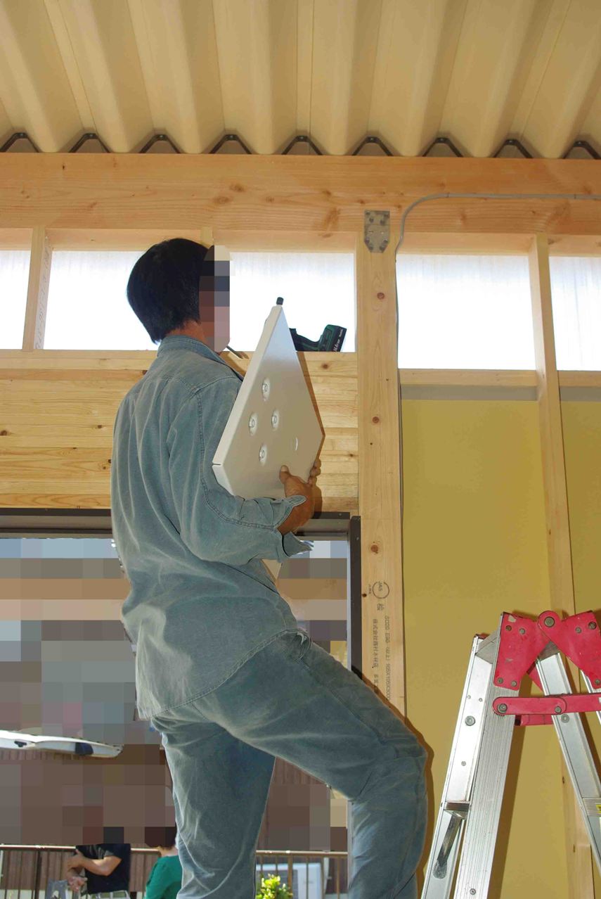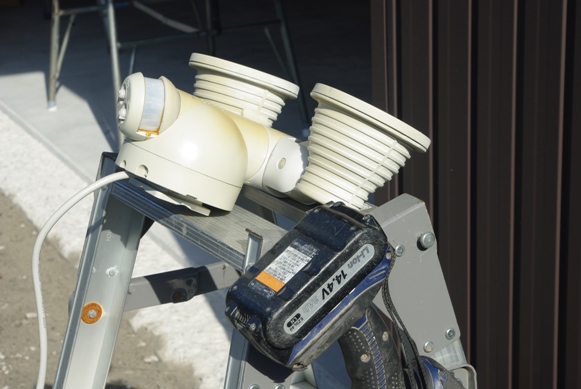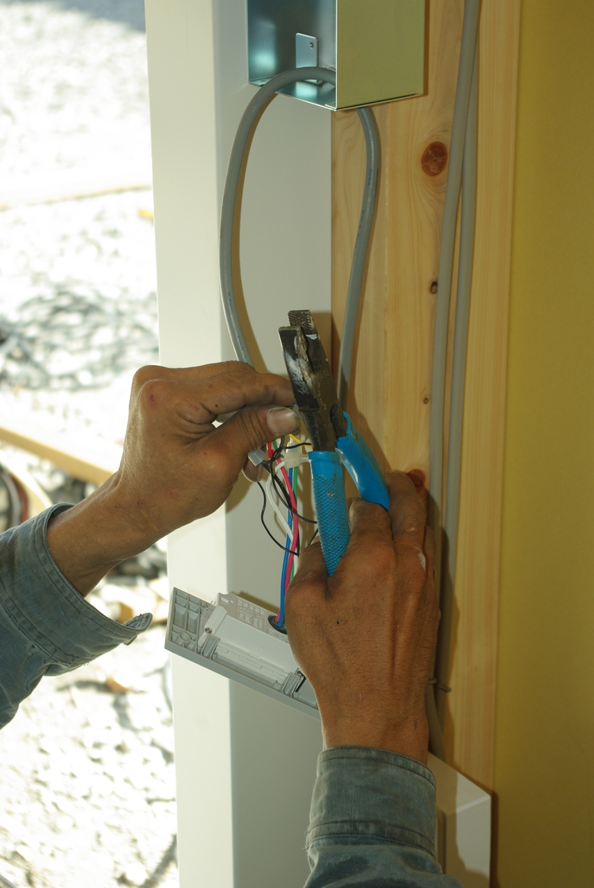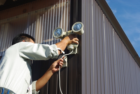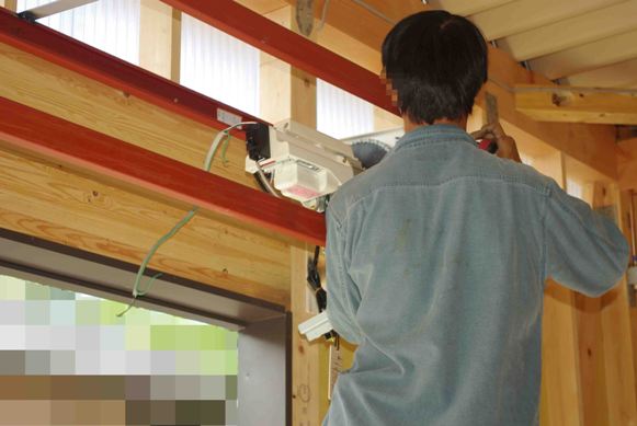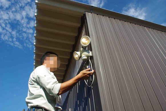 本日は電気屋さんもみえて、電動シャッター用の配線と以前から依頼してあったセンサーライトを取り付けにみえました。