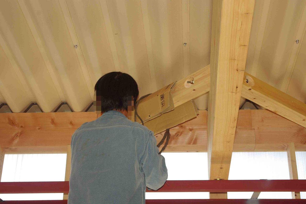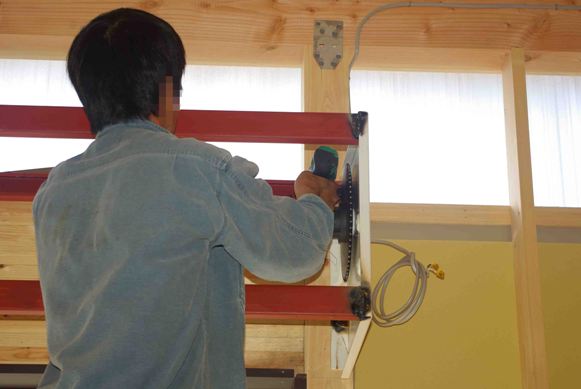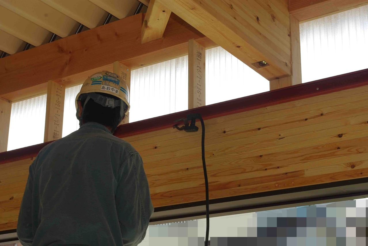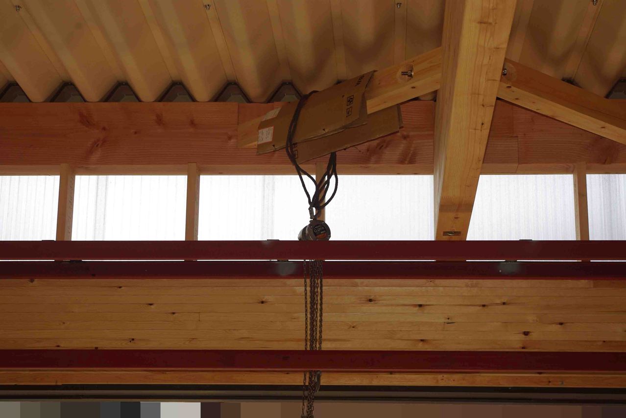 真ん中の火打ち梁にワイヤーを引っ掛けました。
