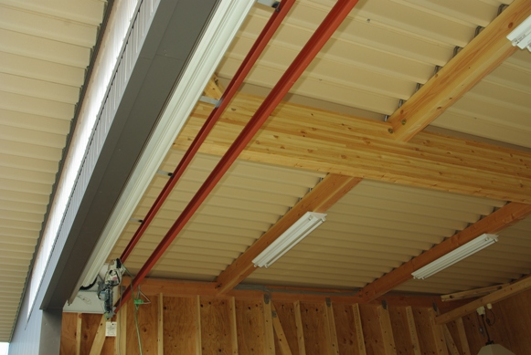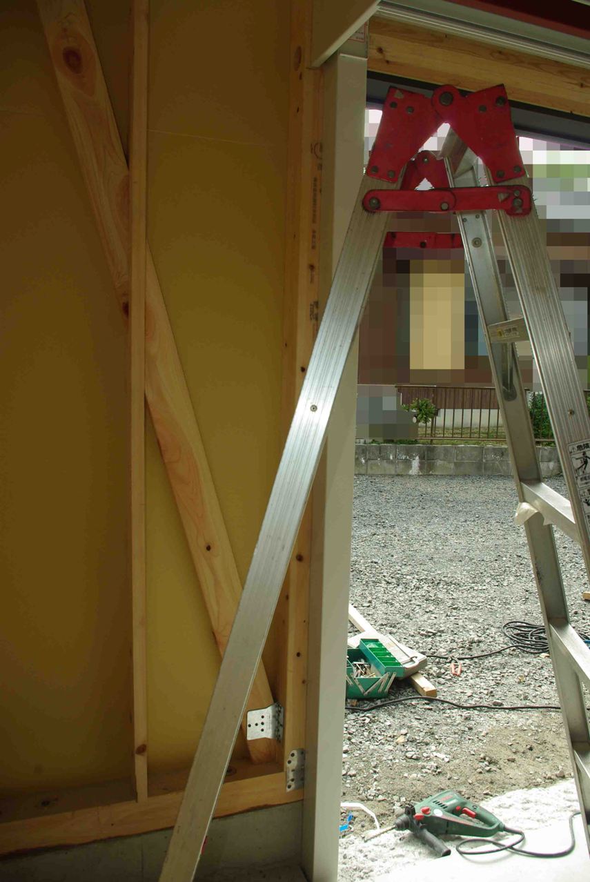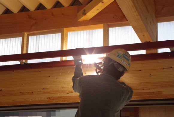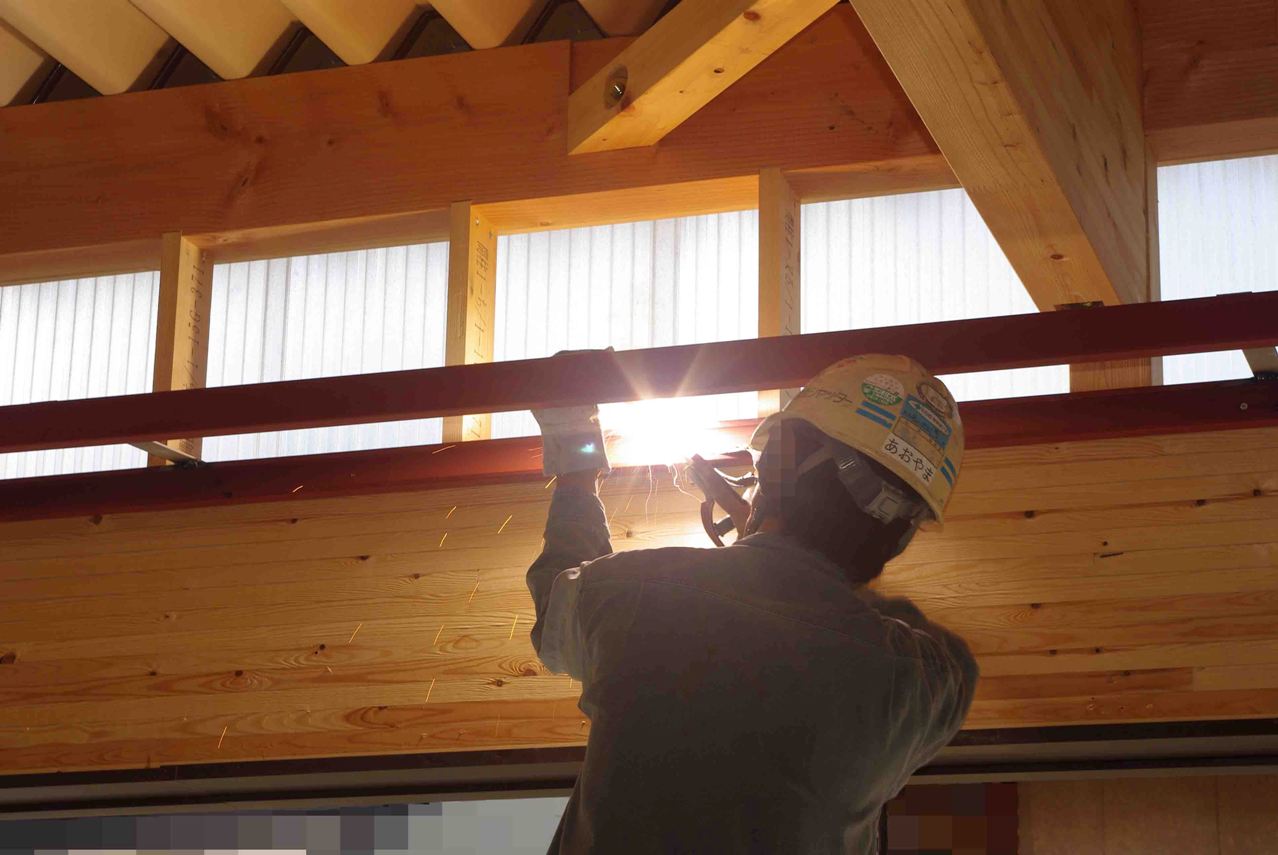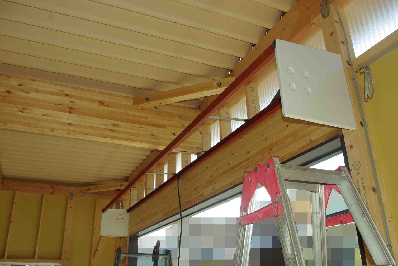 真ん中の火打ち梁にワイヤーを引っ掛けました。