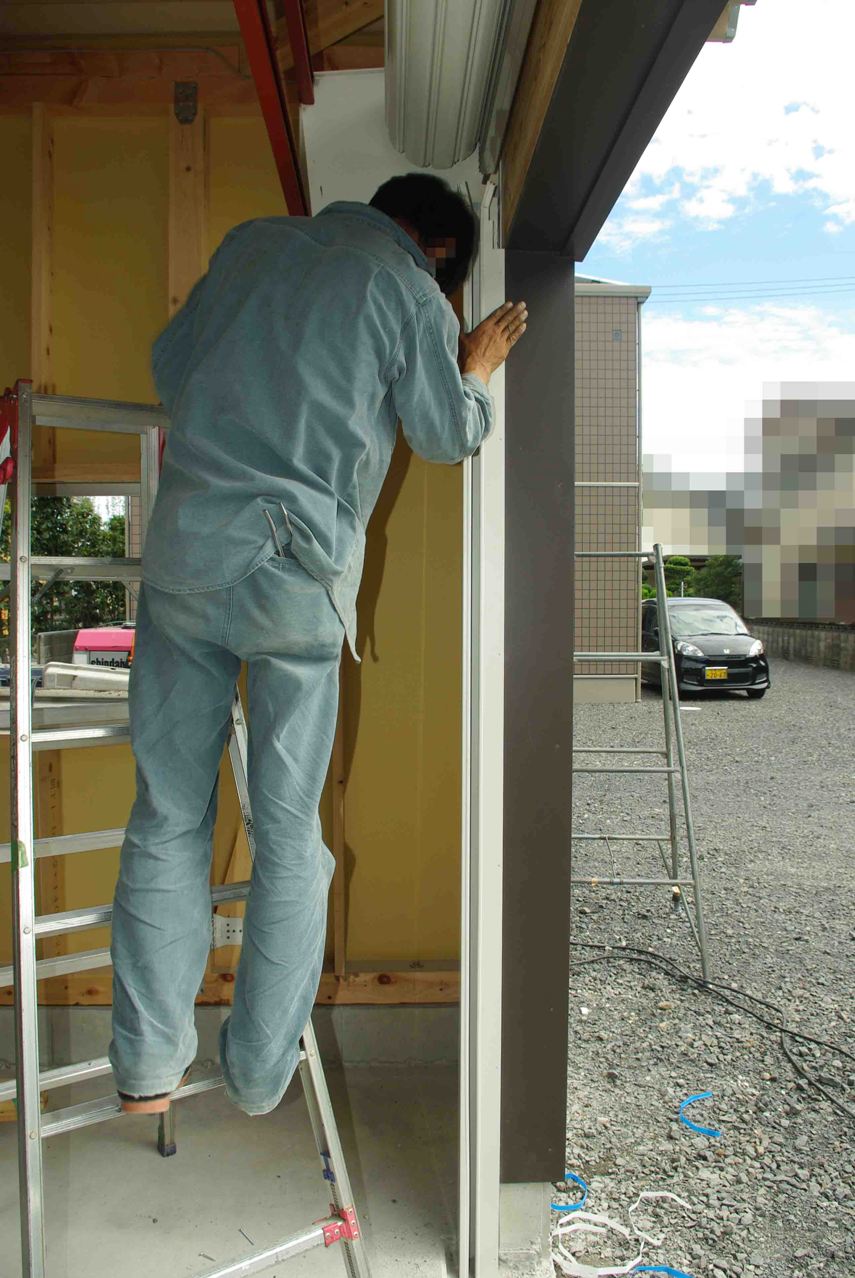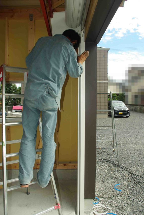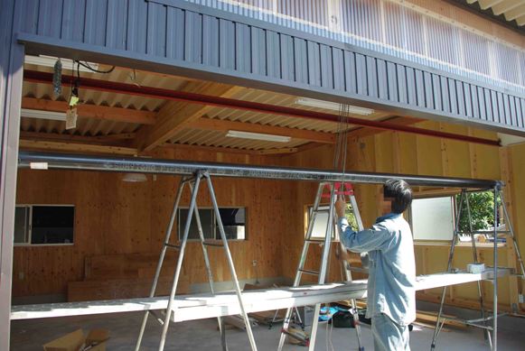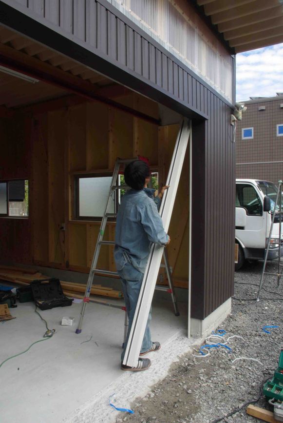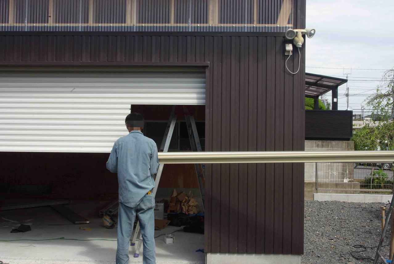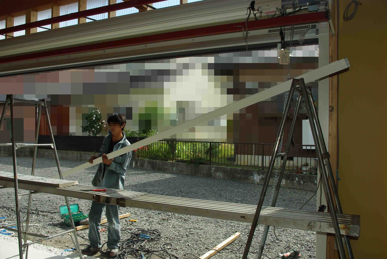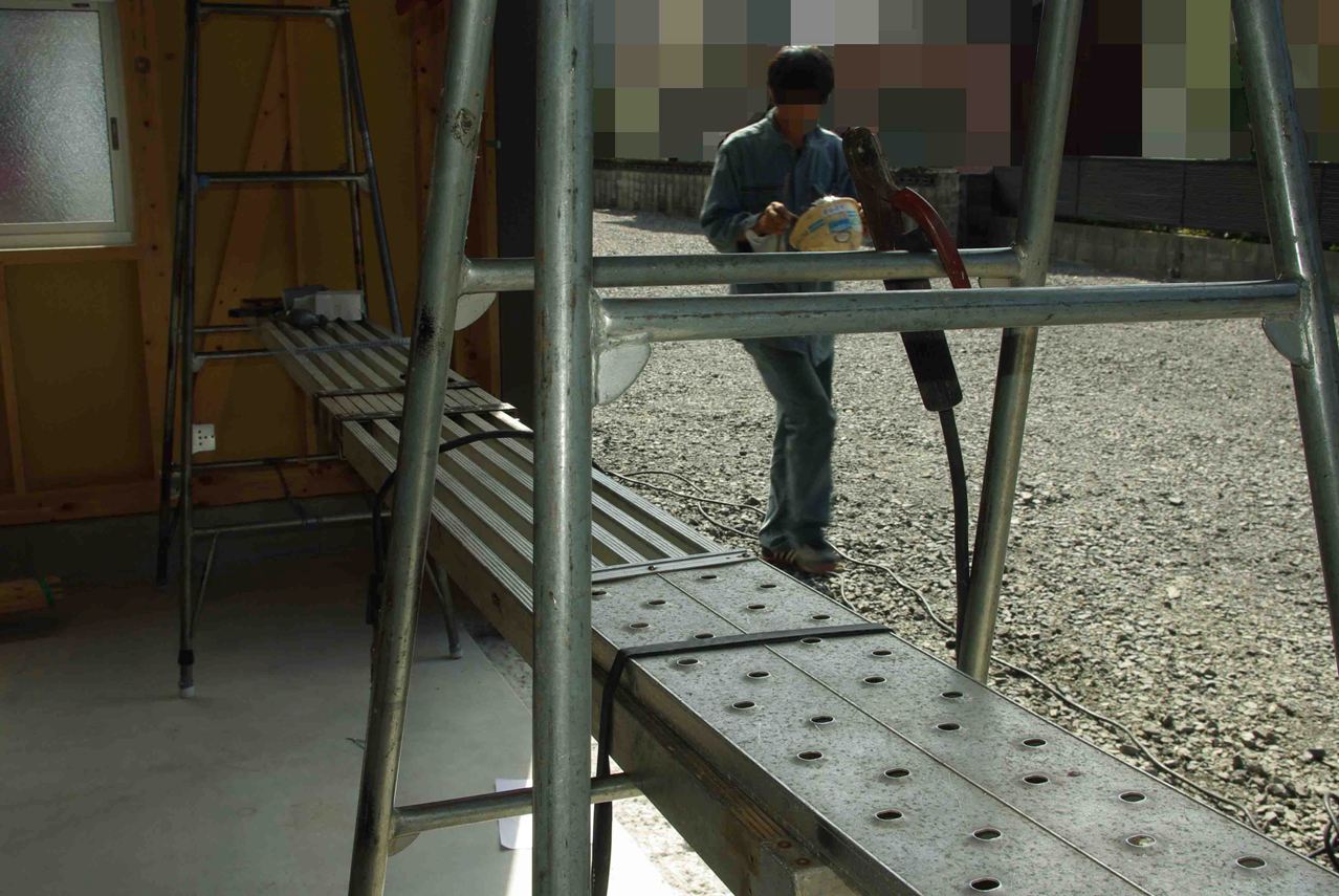 シャッター屋さんは、作業に取り掛かるための足場を組んでいます。