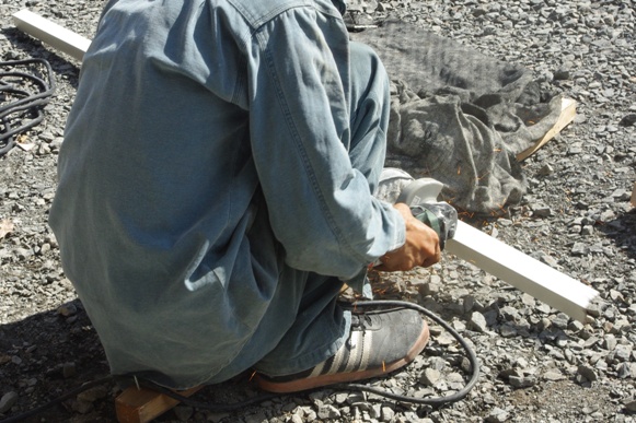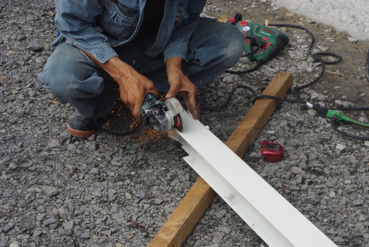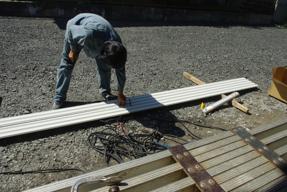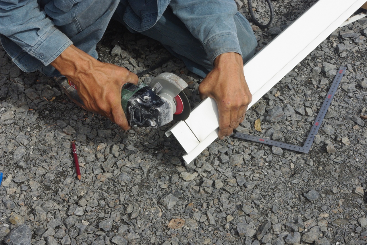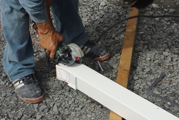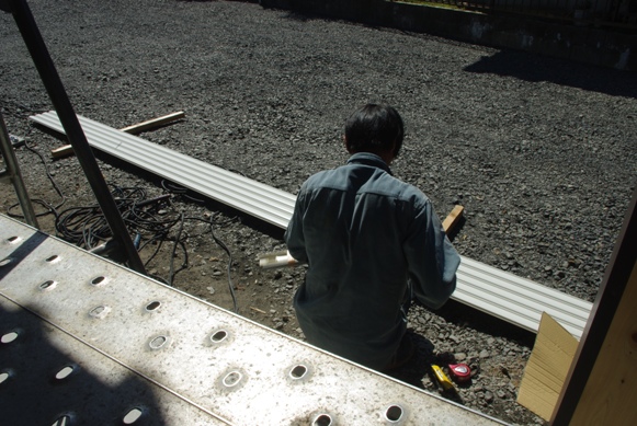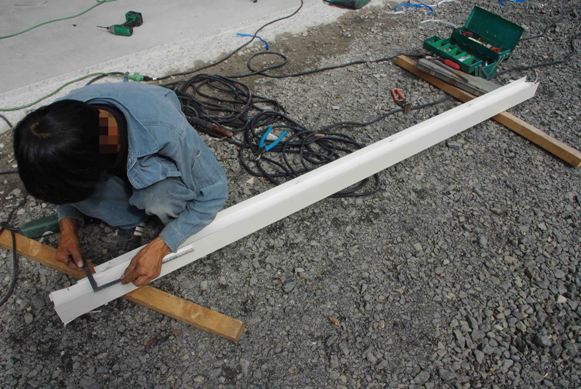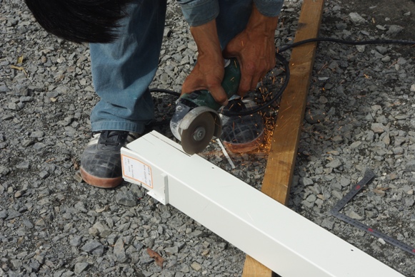 次に特別に用意してきた、L字断面のスチール製ステーを適当な長さにカットします。