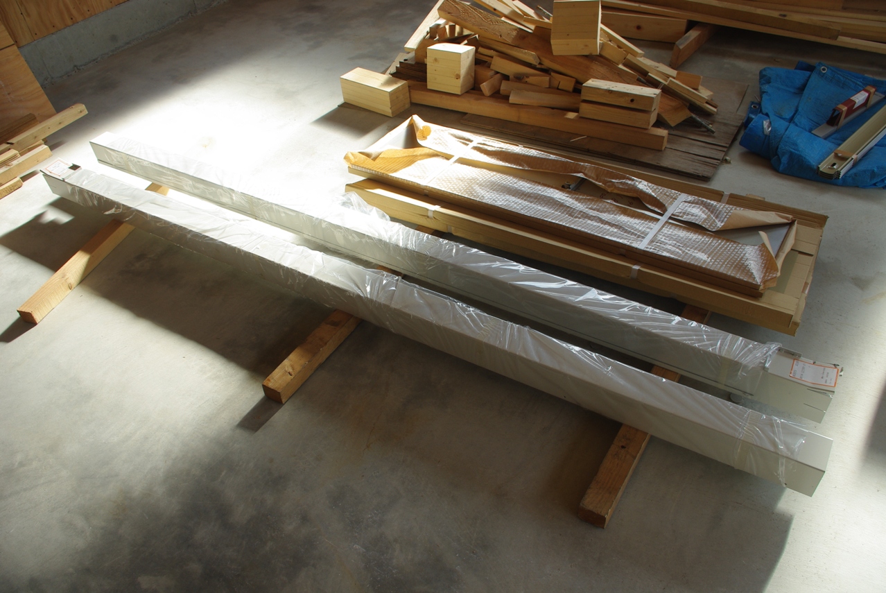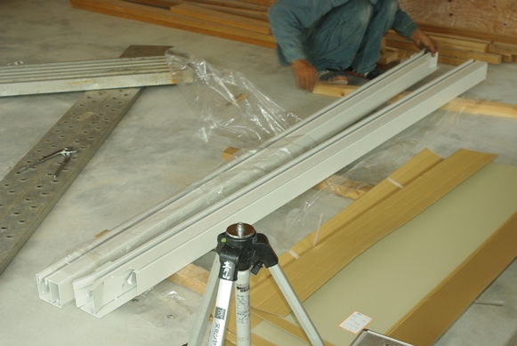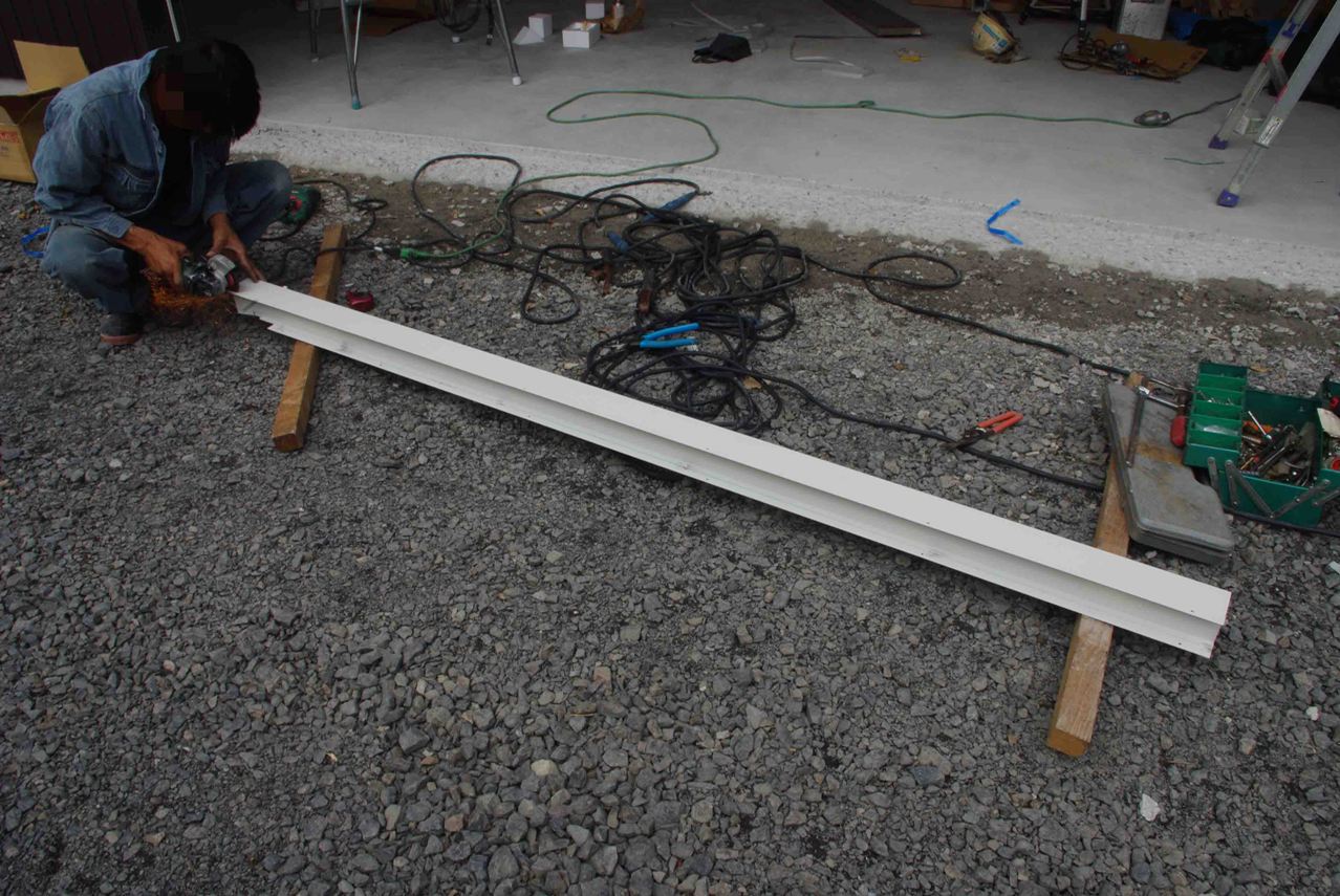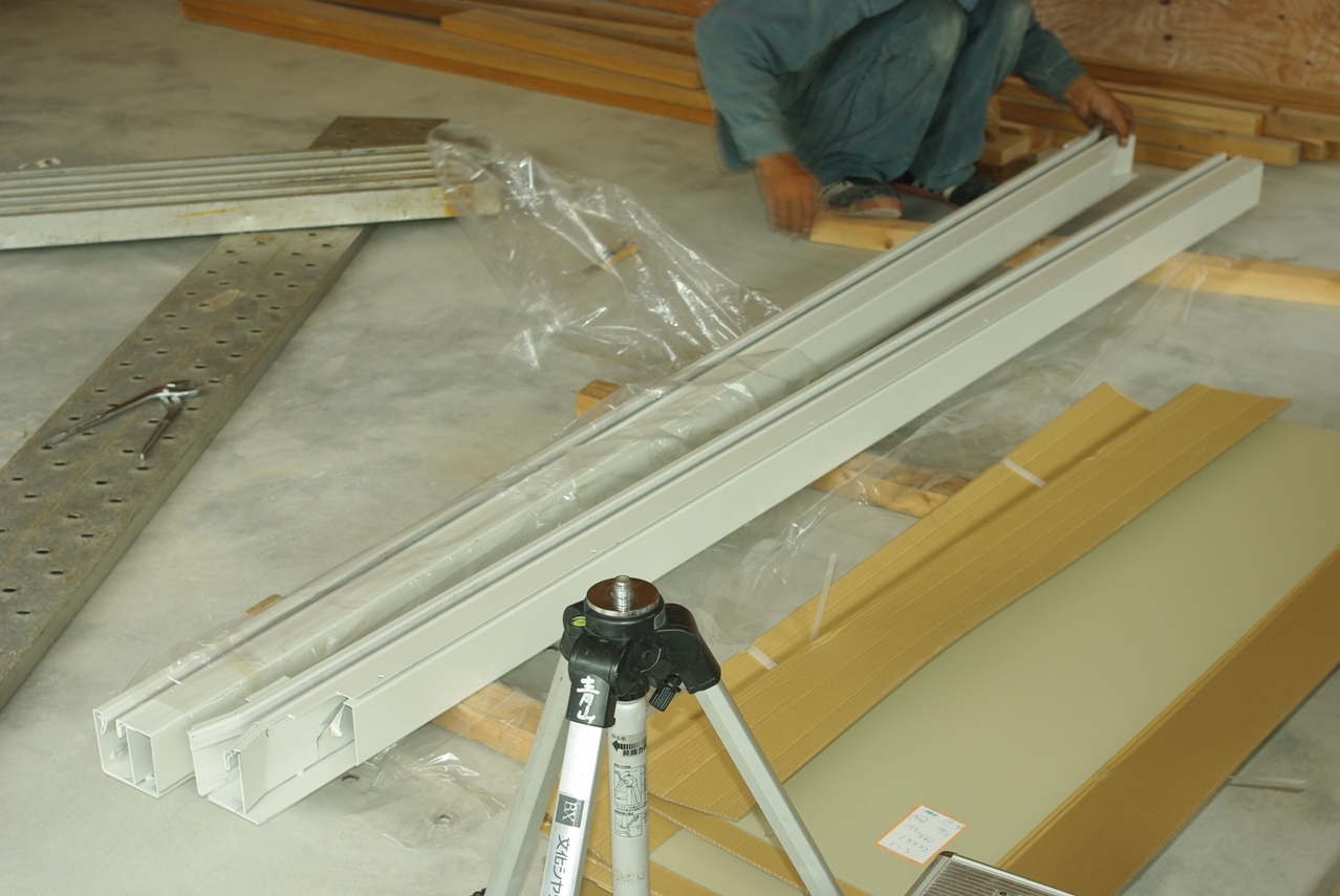 手前に見える白い鉄骨は、柱に取り付けるガイドレールです。