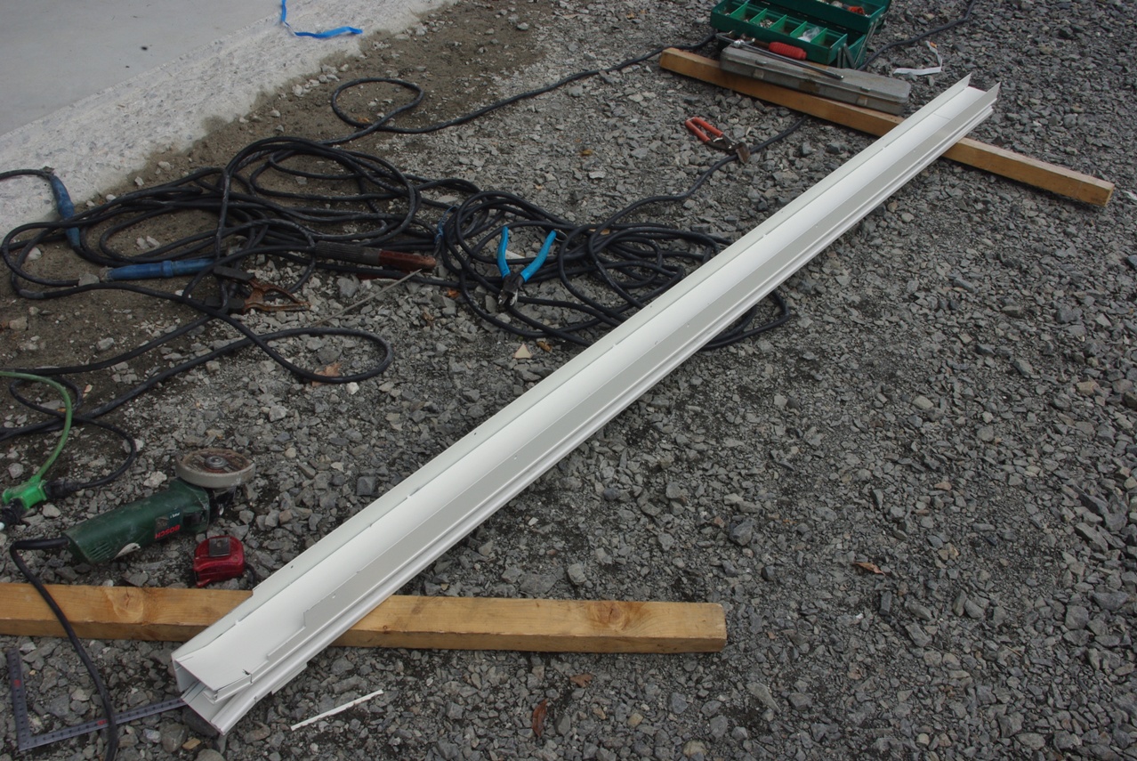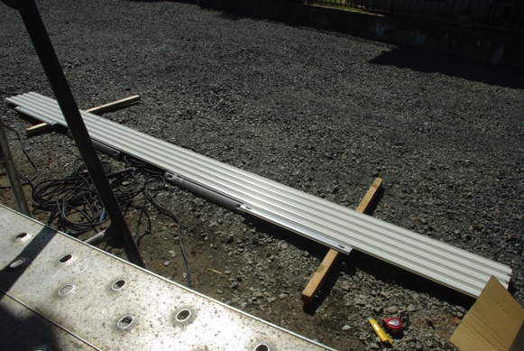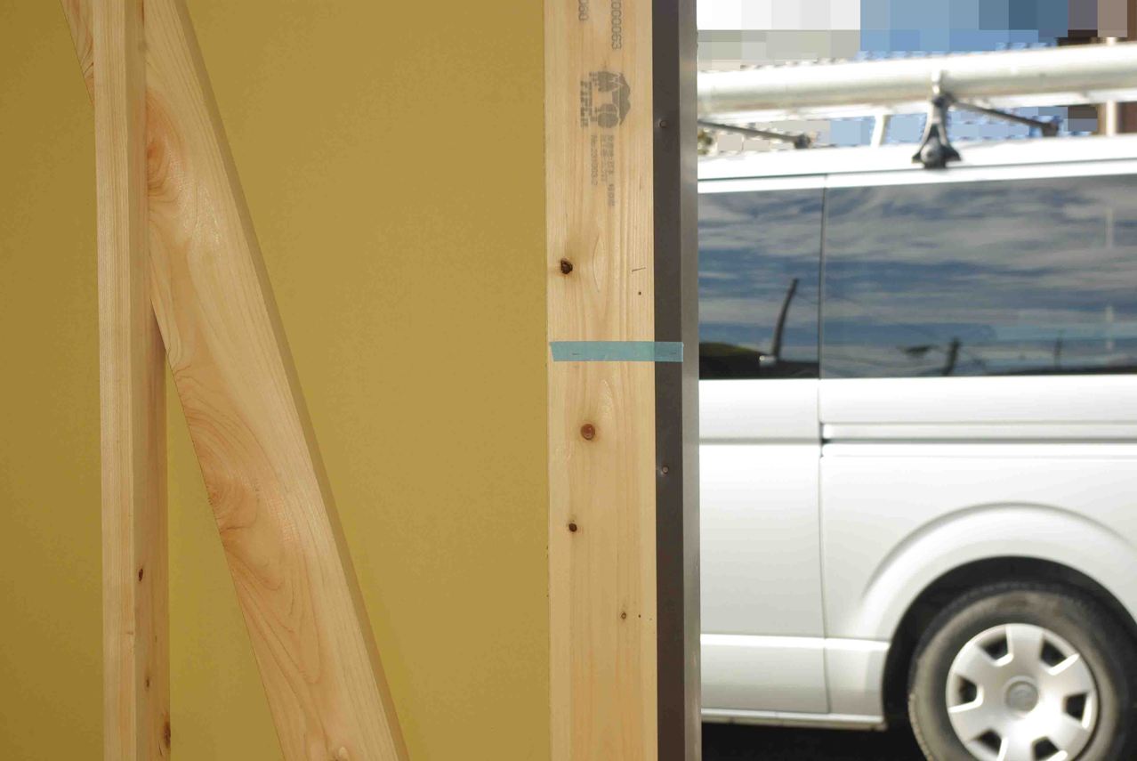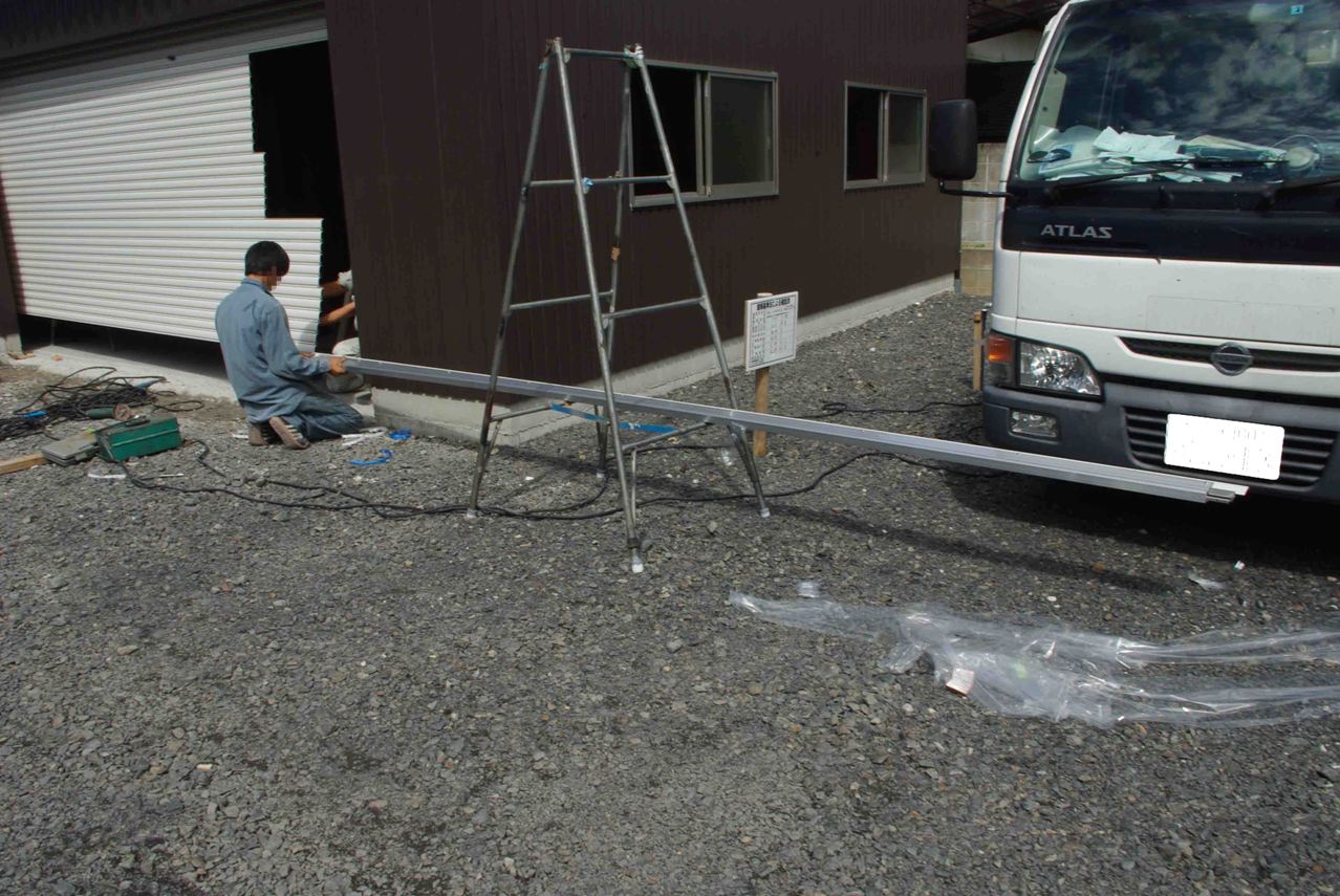 手前に見える白い鉄骨は、柱に取り付けるガイドレールです。