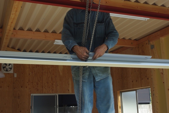 カーテンを枚繋げたところで、チェーンブロックを引き上げました。
