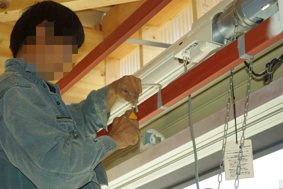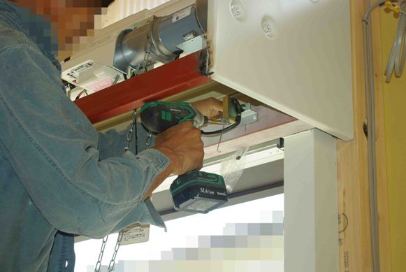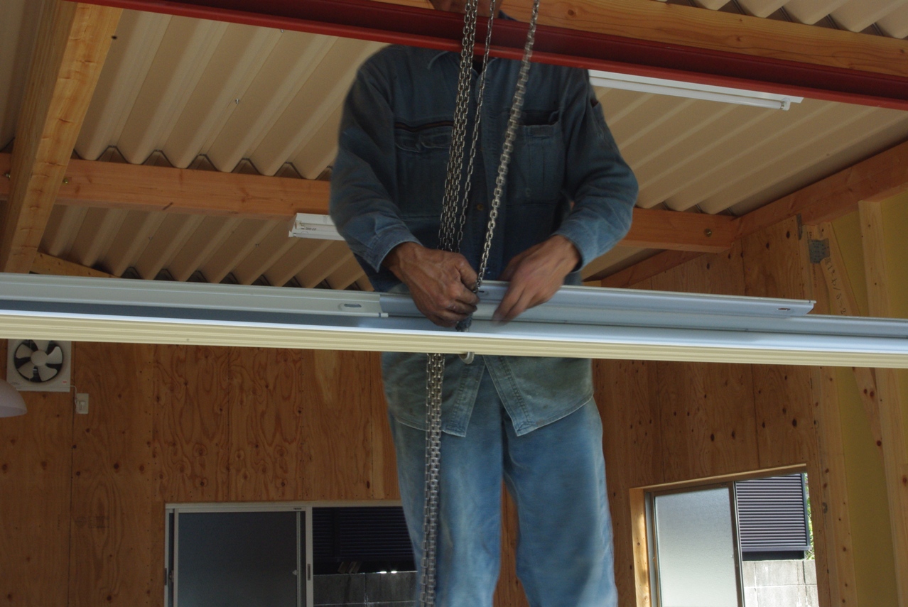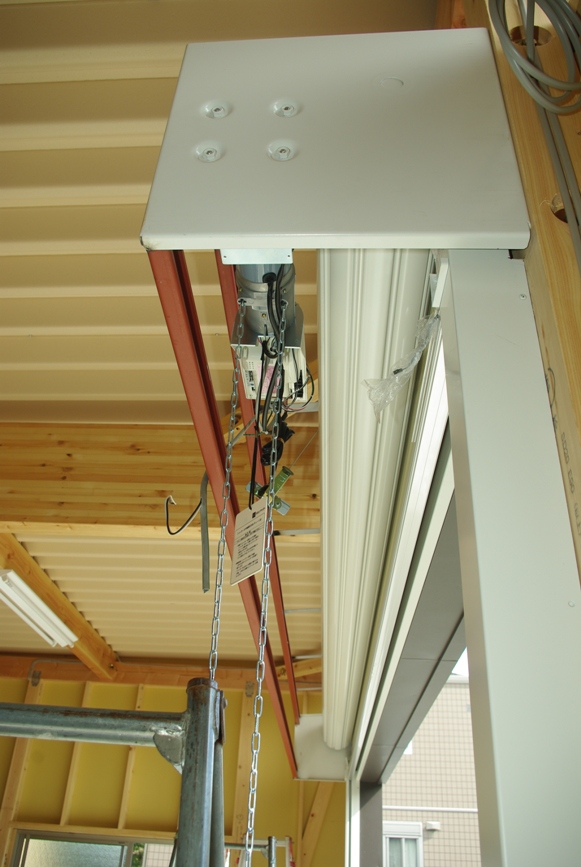 カーテン上部がシャフトに固定されましたので、ここでフックを外して、チェーンブロックを取り外しました。