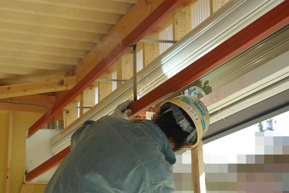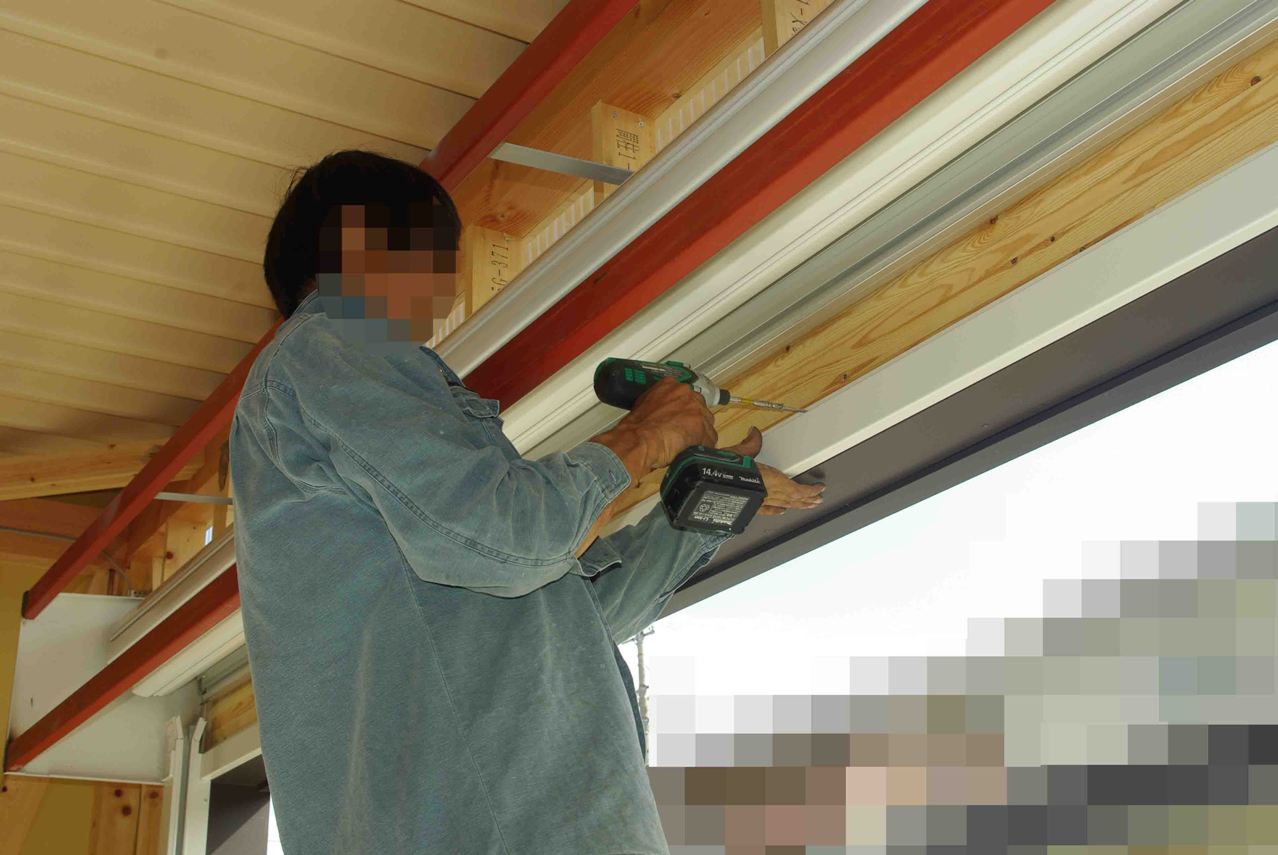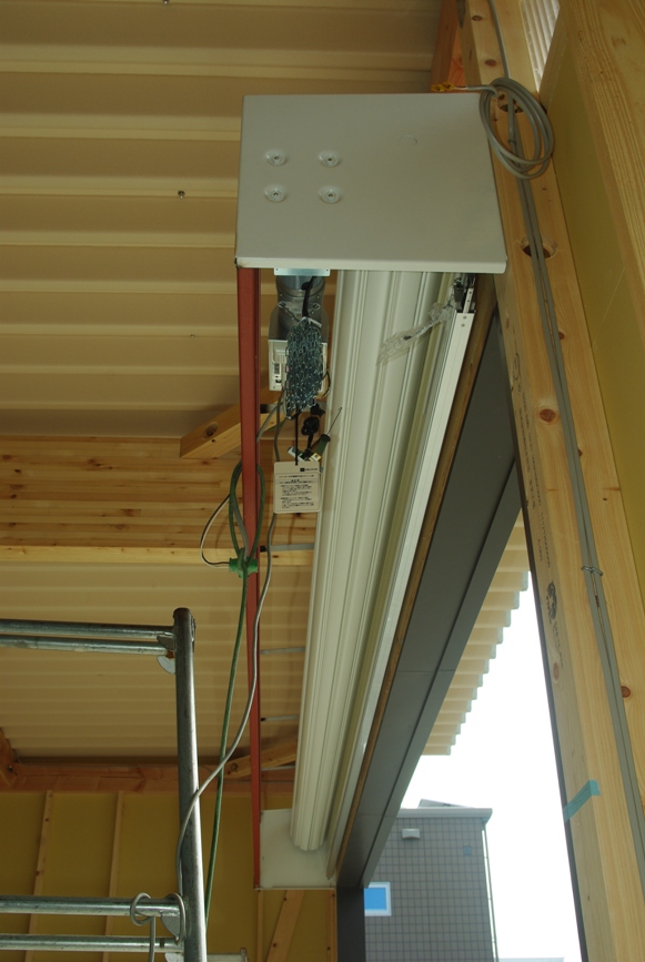 クリアランスのチェックが終了すると、ガイドレールの取り付けのためにカーテンを一旦巻き取りました。