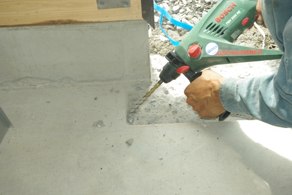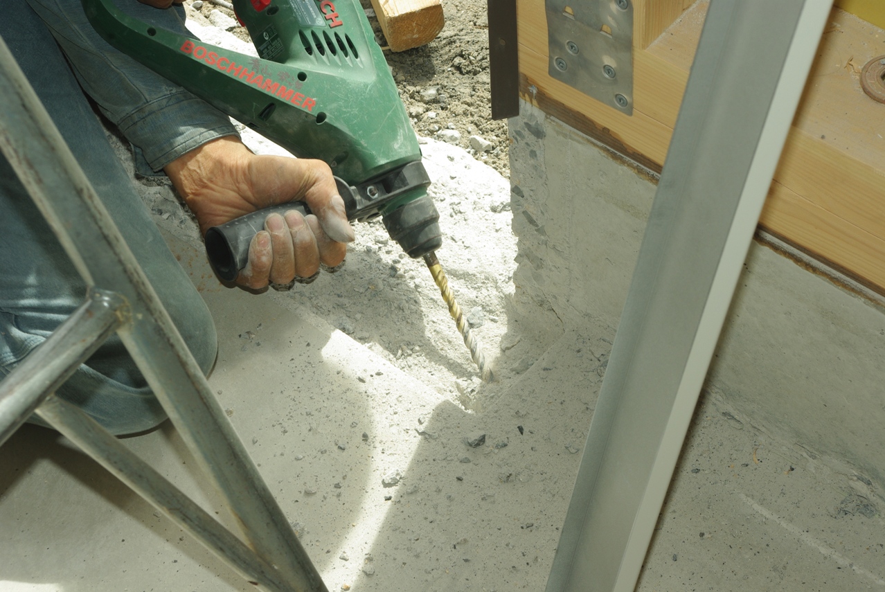 ガイドレールのブラケットを取り付け位置に合わせてみると、下のはつった床部分が若干浅かったので、急遽ハツリ機で削っています。