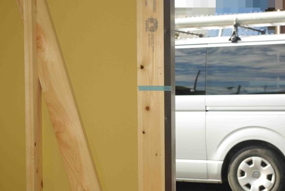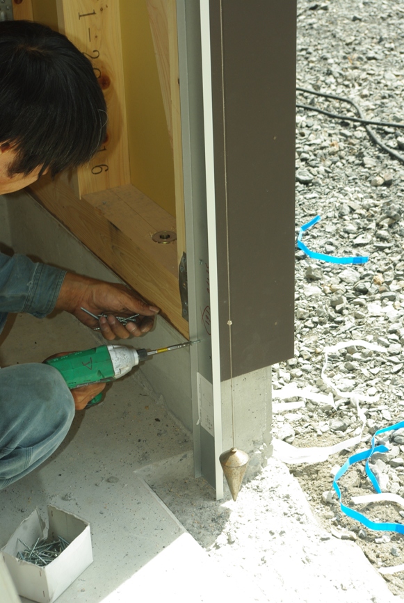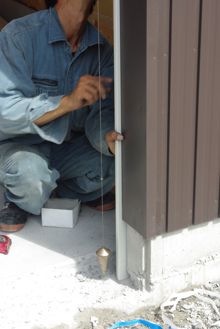 下げ振りをブラケット上端部に取り付けて、柱の鉛直を確認すると同時に、ブラケットの取り付け位置を決定します。