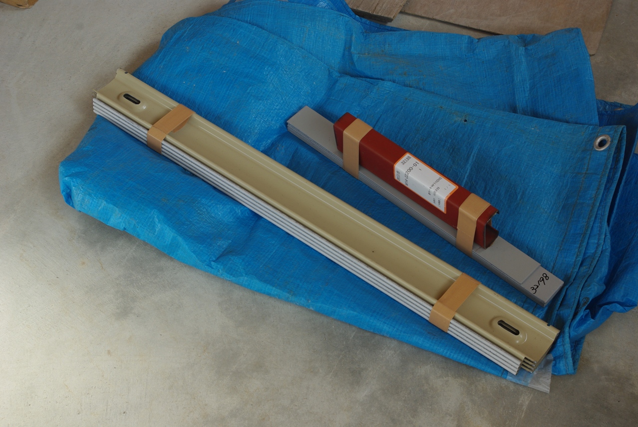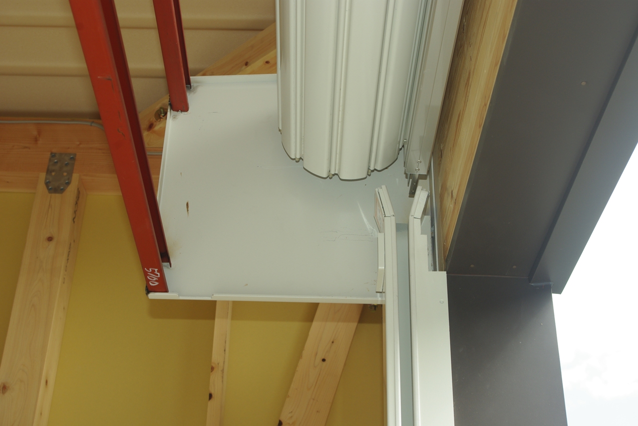 シャッターカーテン収納口前化粧パネルとガイドレールのフィッティングです。