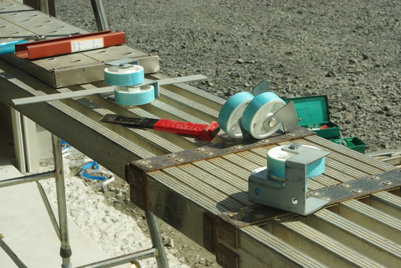 ガイドローラーの基台を、マーキングに合わせて位置を決めて溶接します。