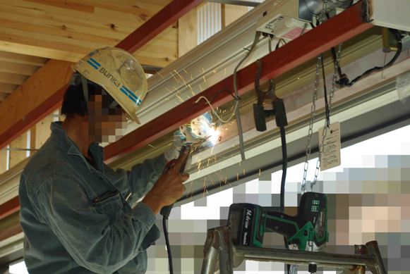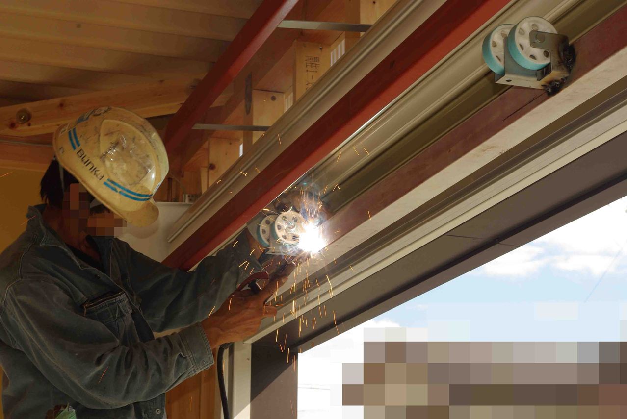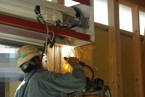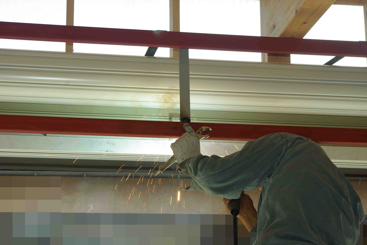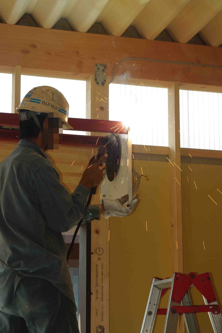 2本目の鉄骨まぐさもセットして、開閉機側ブラケットに溶接します。