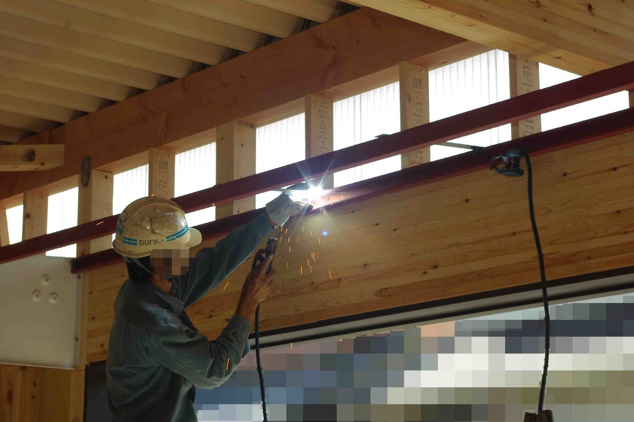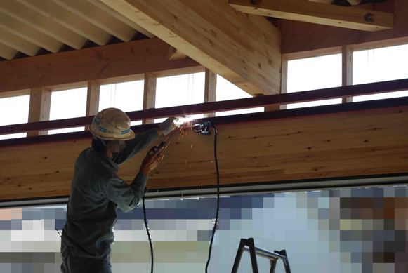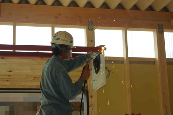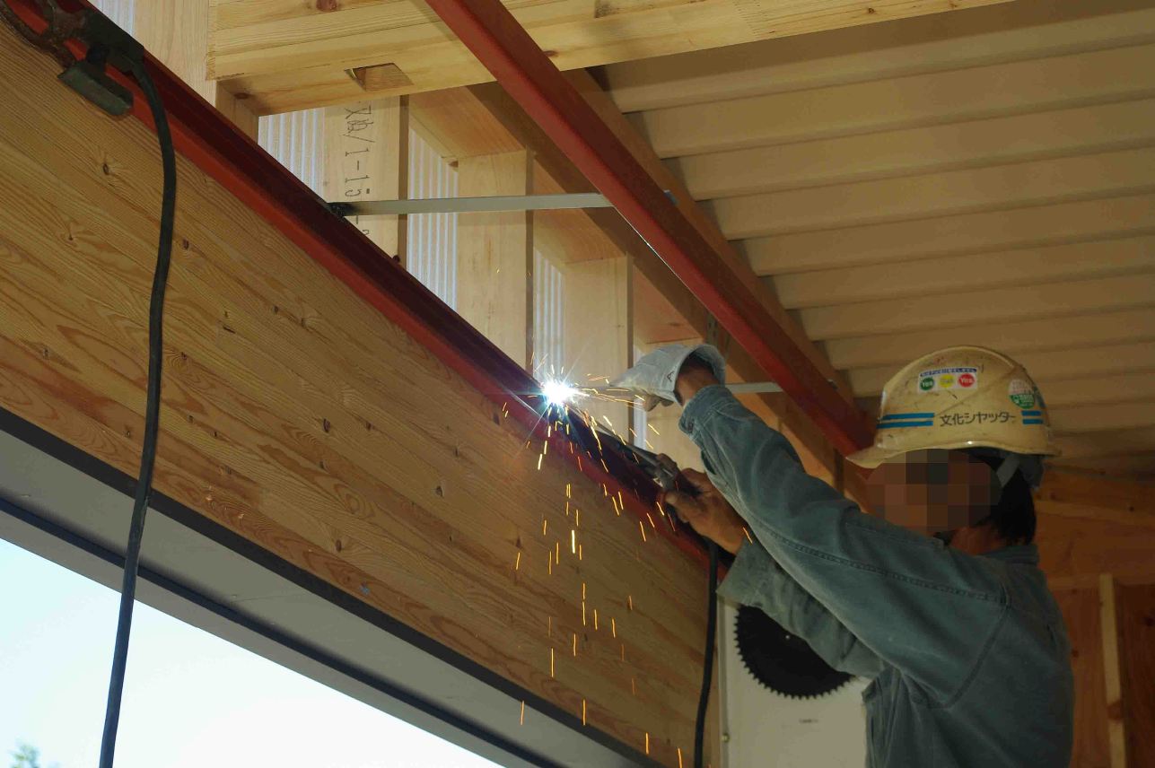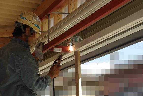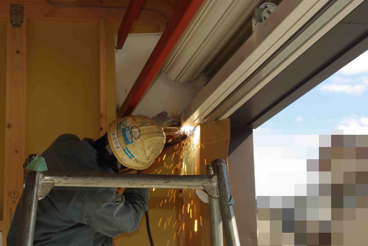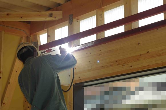 アーク溶接でまぐさをブラケットに溶接して固定します。