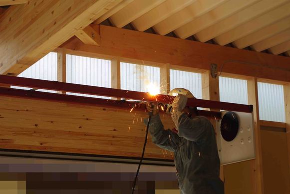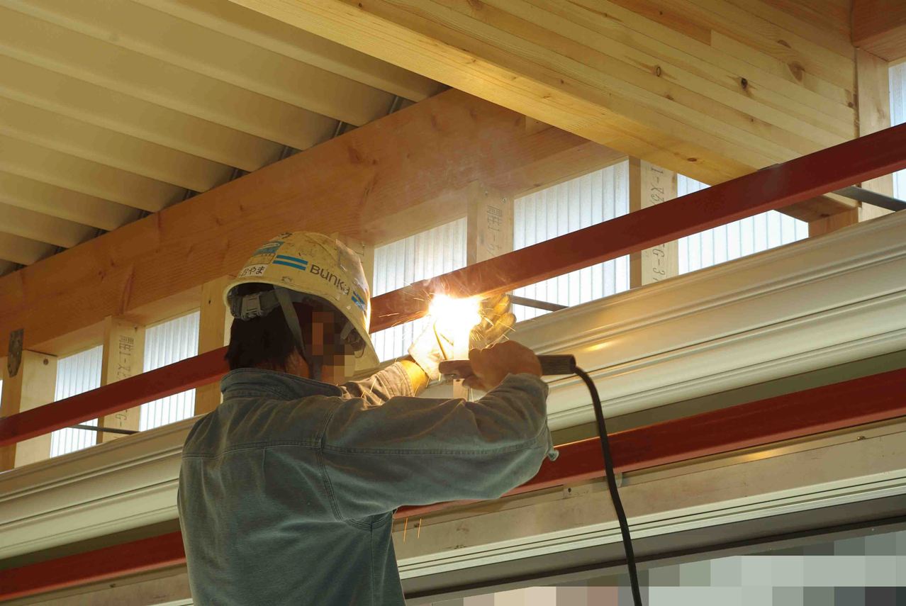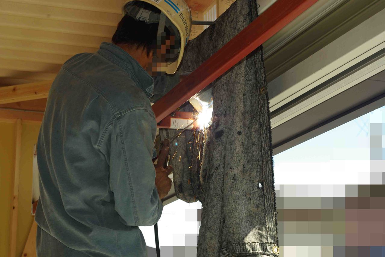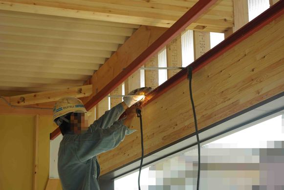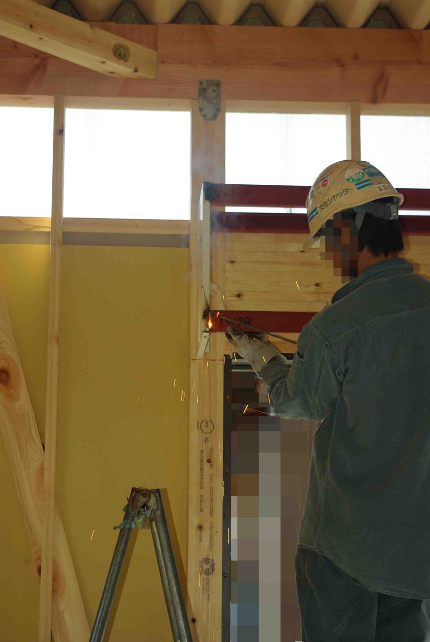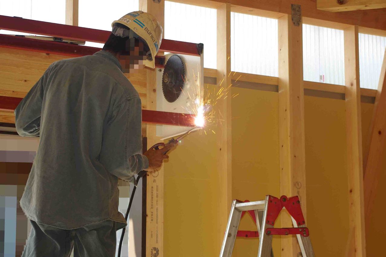 アーク溶接でまぐさをブラケットに溶接して固定します。