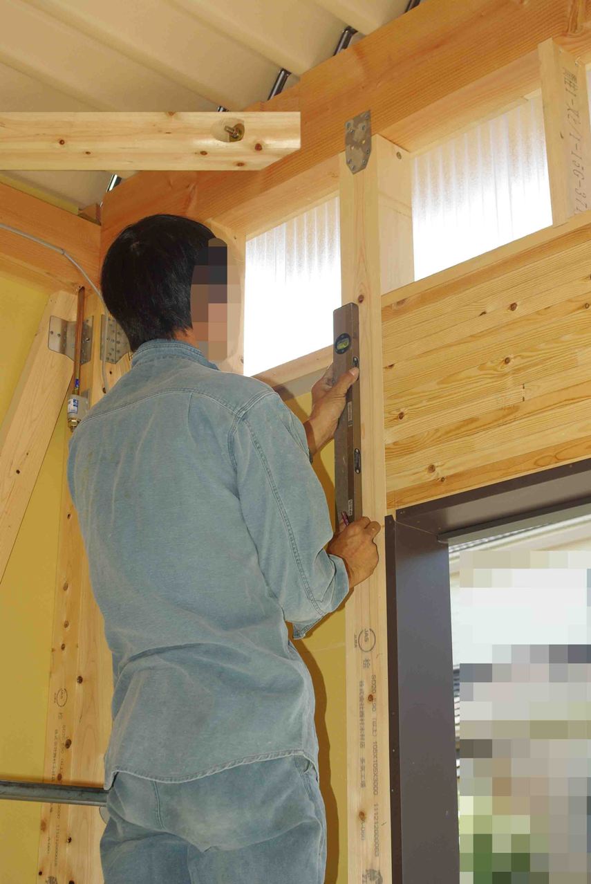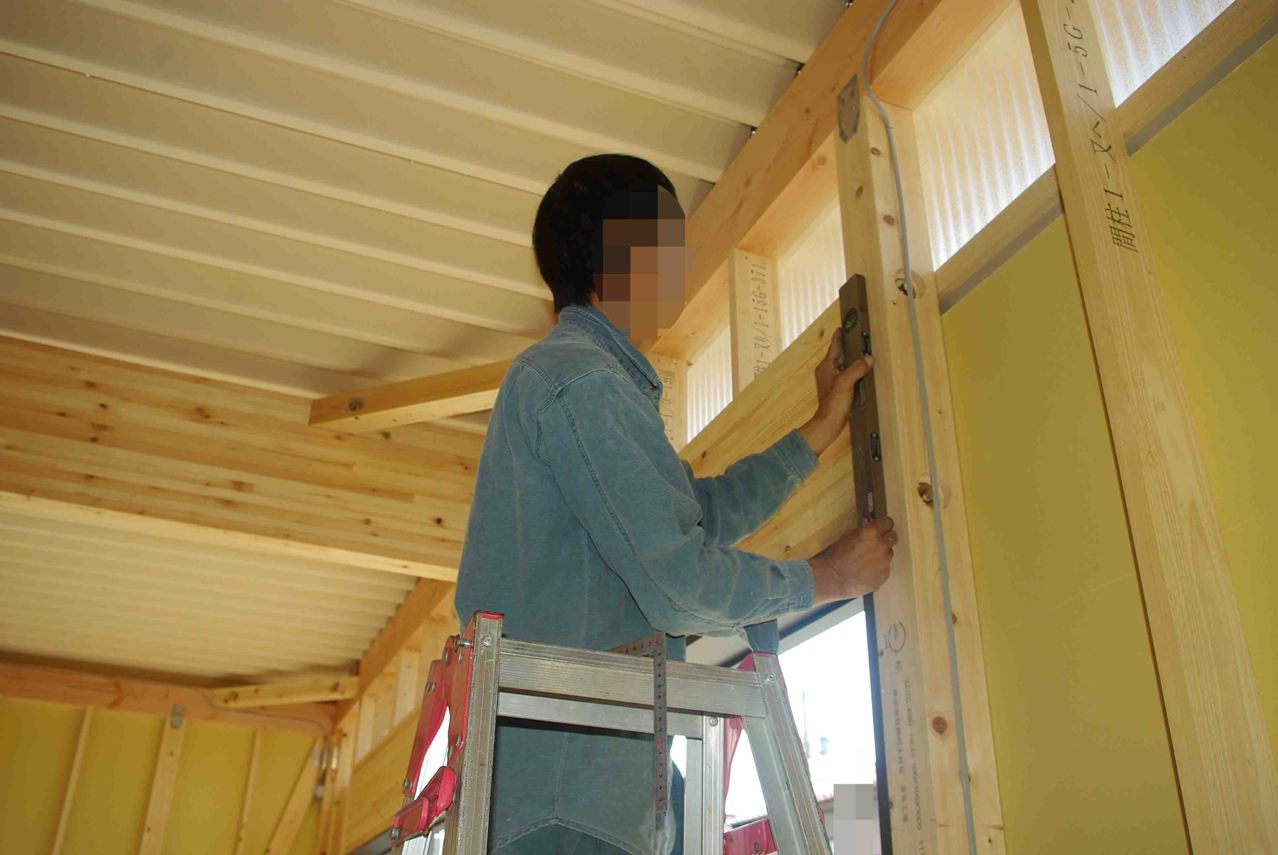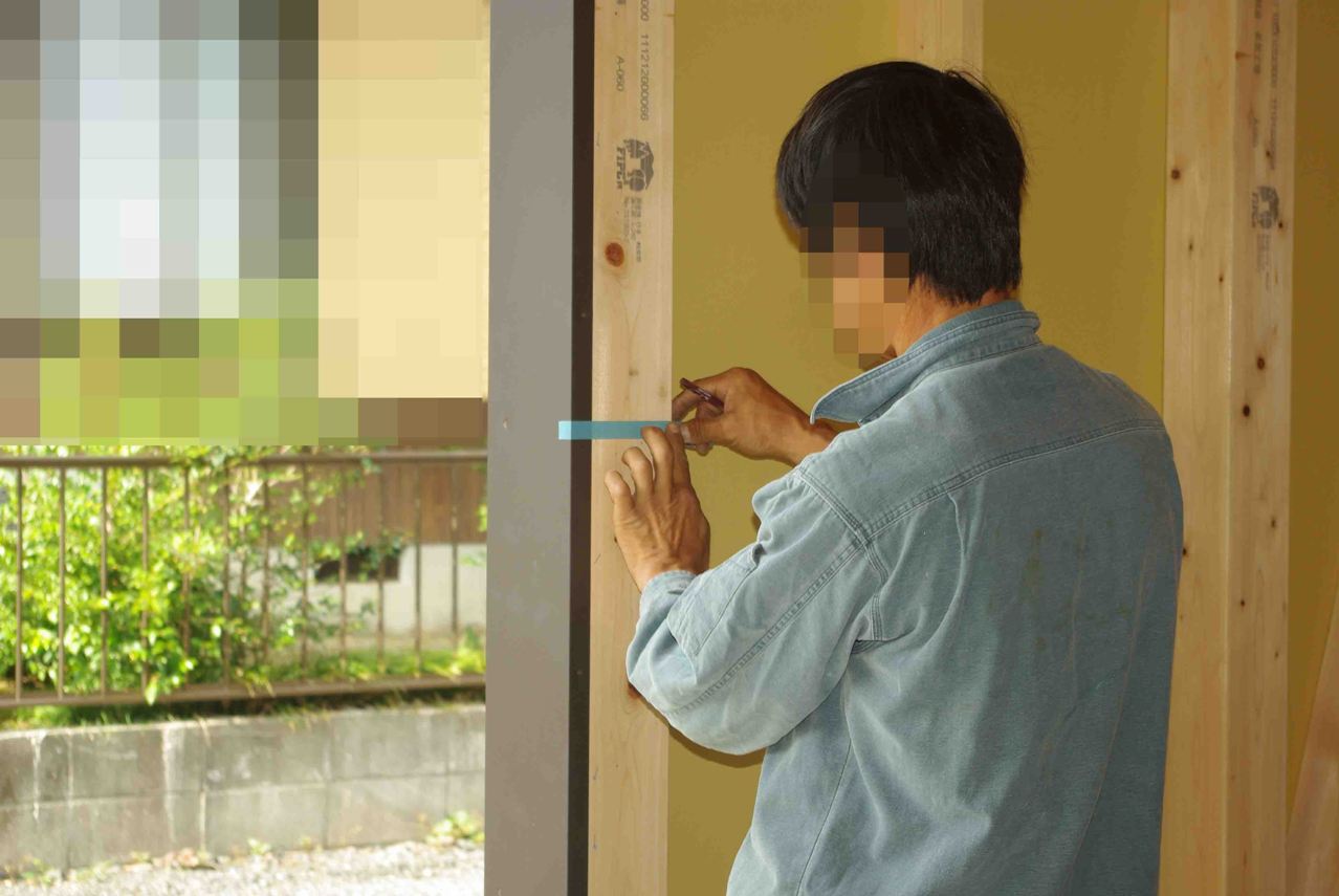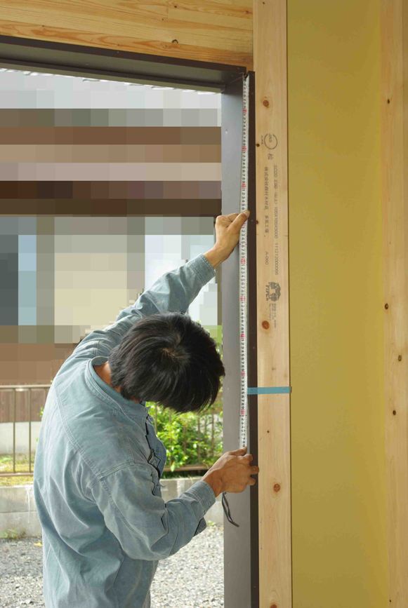 柱の基準マークから長押(なげし)までの高さを計測しています。