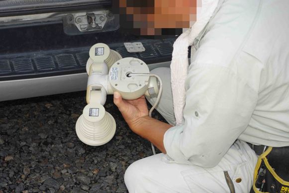 台座が柱に固定されて、センサーライト本体を取り付けます。