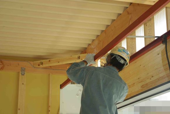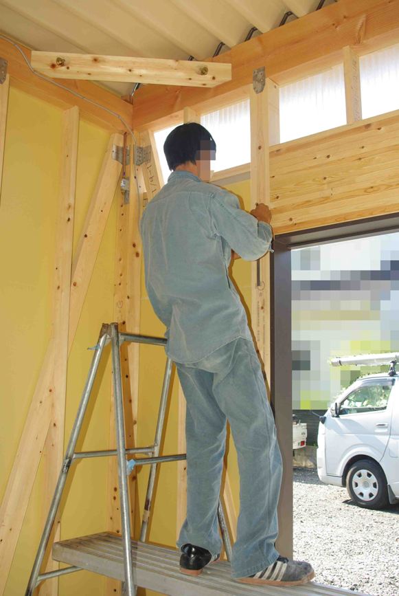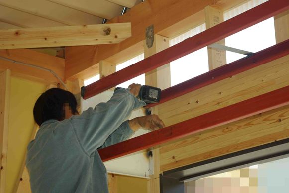 一本目の鉄骨まぐさを、ブラケット付け根上部に取り付け、長押(なげし)に木ねじで数カ所固定します。