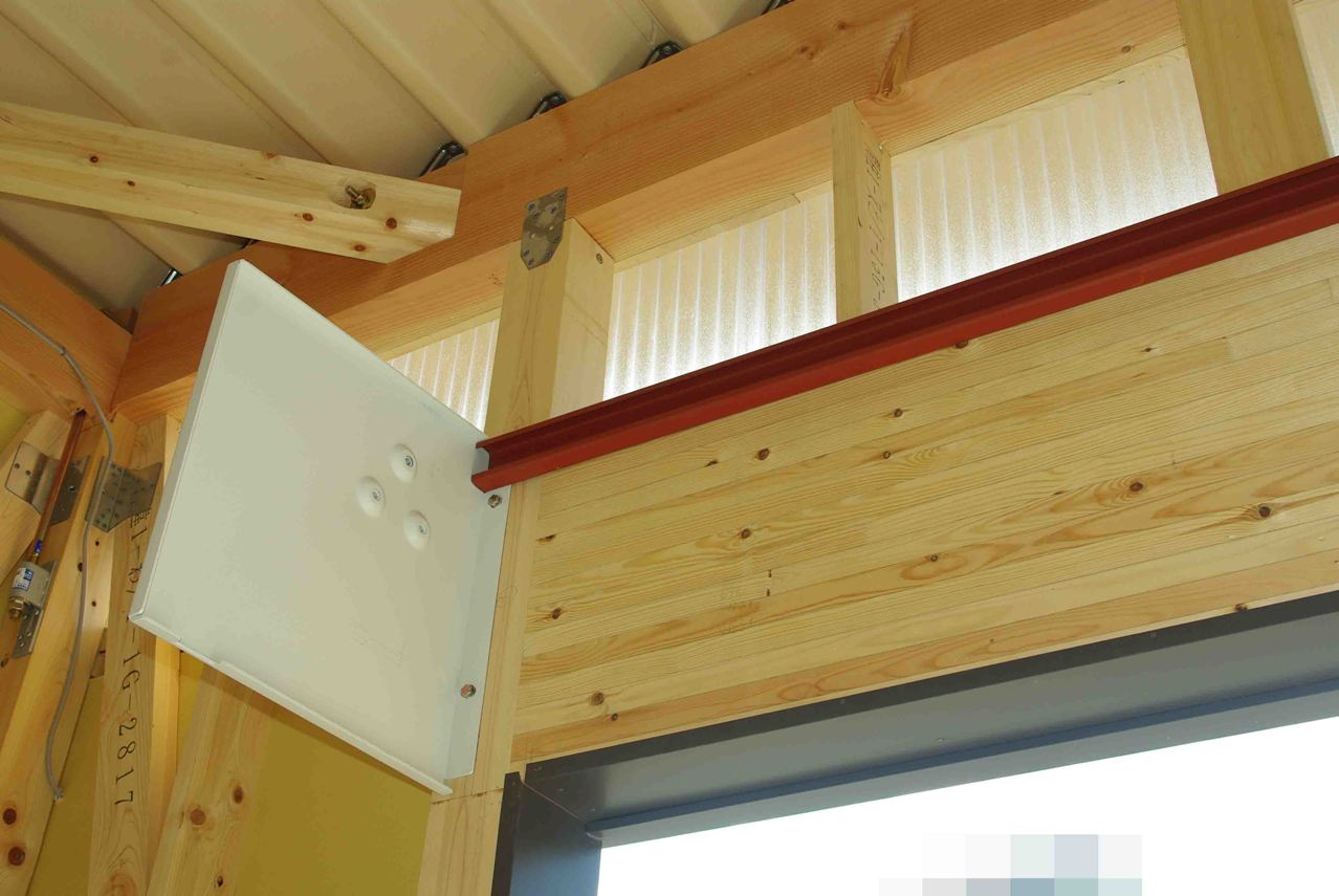 長押(なげし)の高さが450oでその上に明かり取りの窓が開いていますので、外付けのシャッターケースの場合高さが500oあって、長押(なげし)の上に50oはみだしてしまいます。