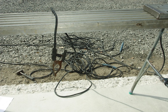 アーク溶接のアースを、固定した一本目の鉄骨まぐさに取り付けました。
