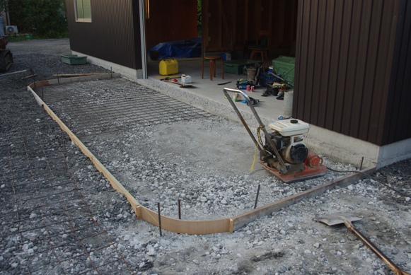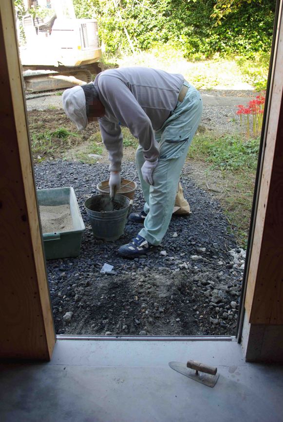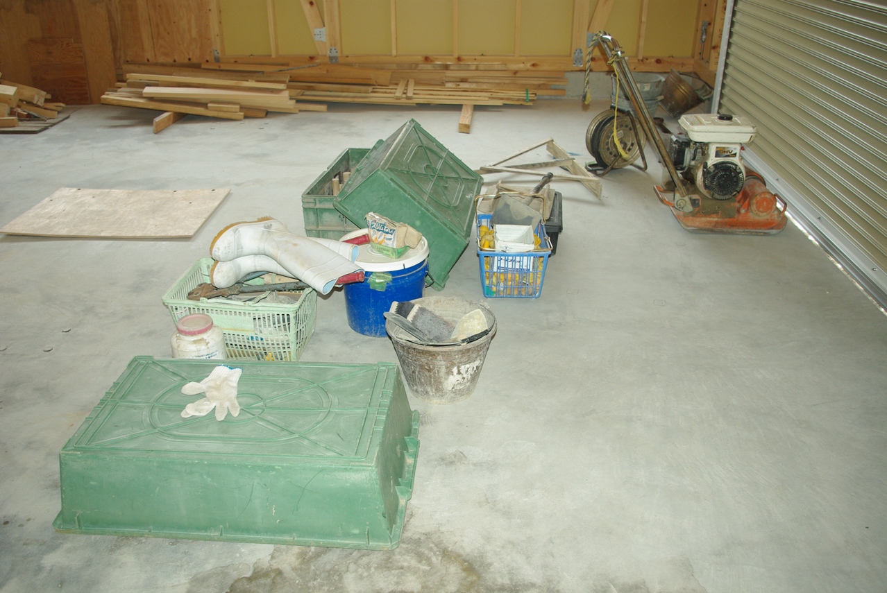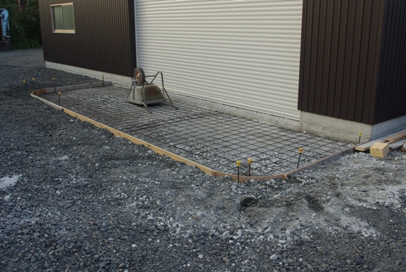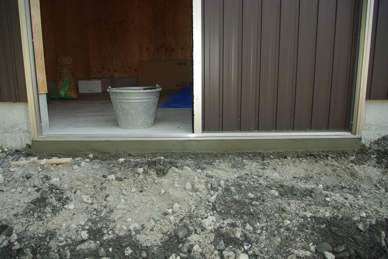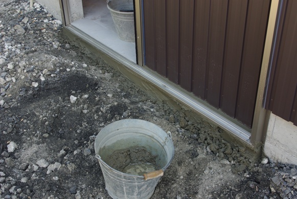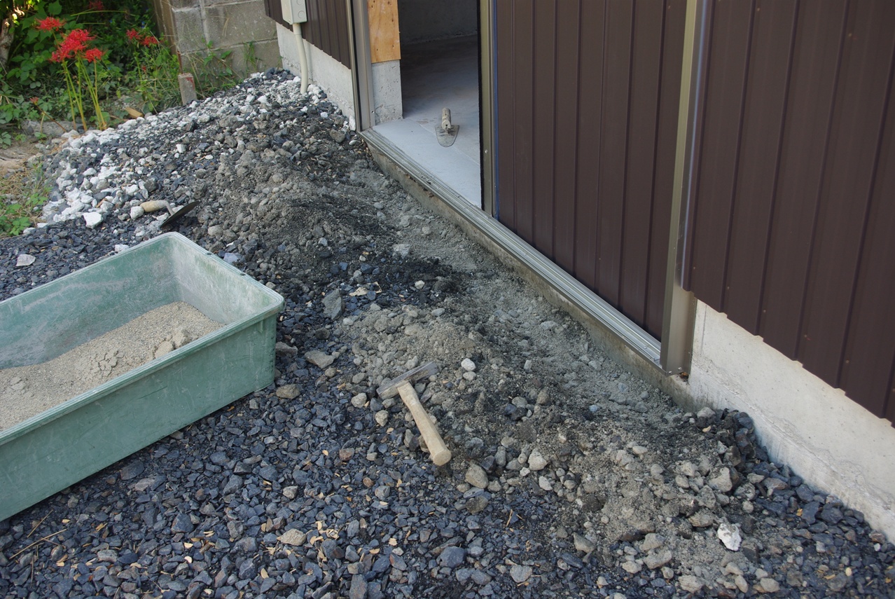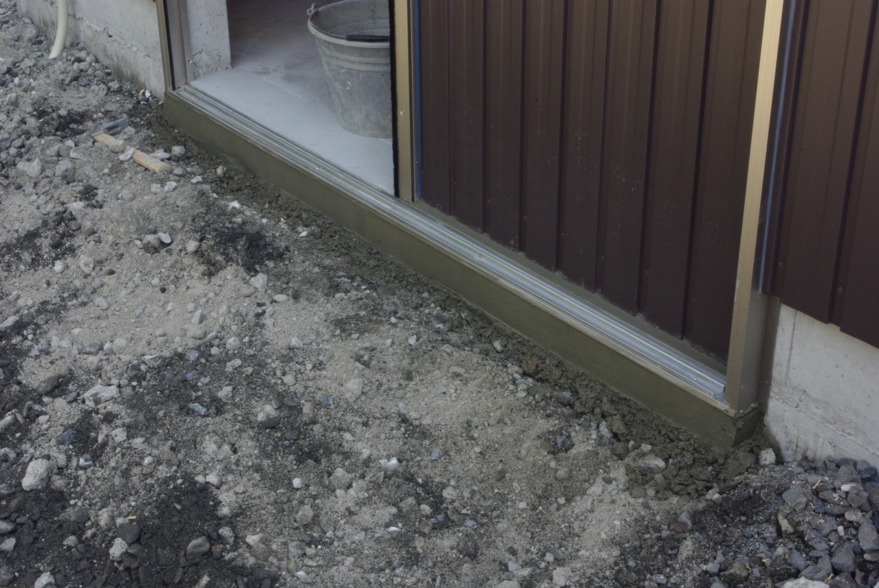 作業とは、倉庫入り口のアルミサッシ枠、間仕切り引き戸のアルミサッシ枠下回りのコンクリートの打ち込みと、ガレージ入り口と倉庫入り口の外構アプローチの設置です。