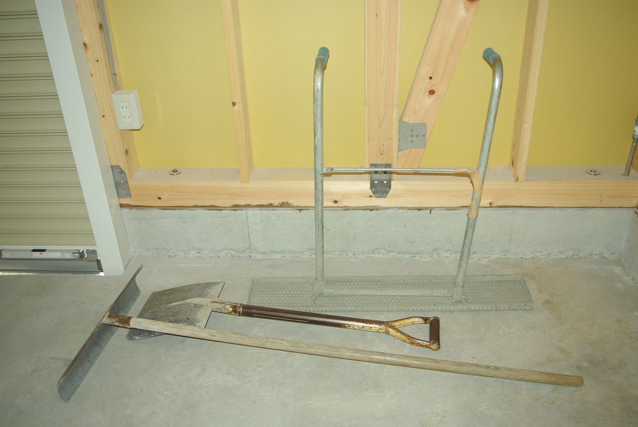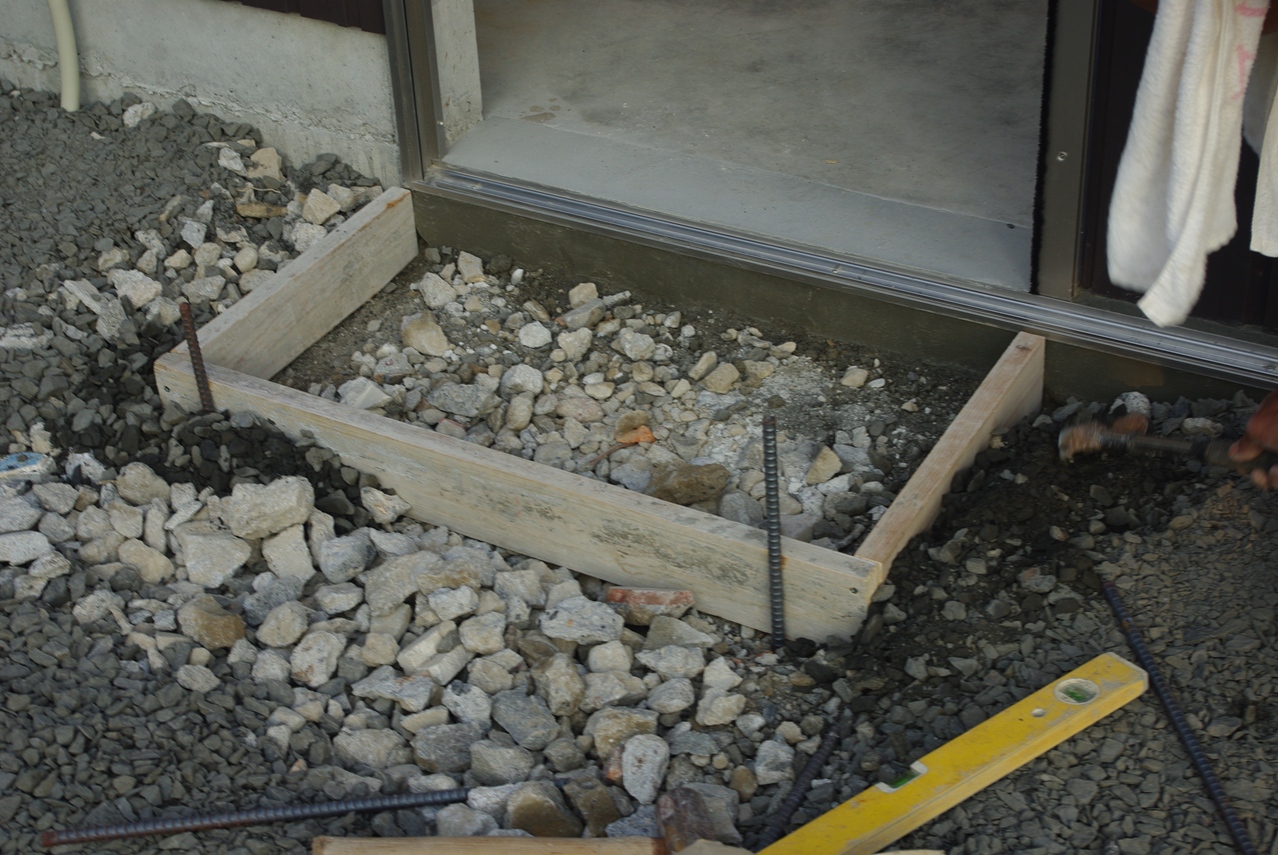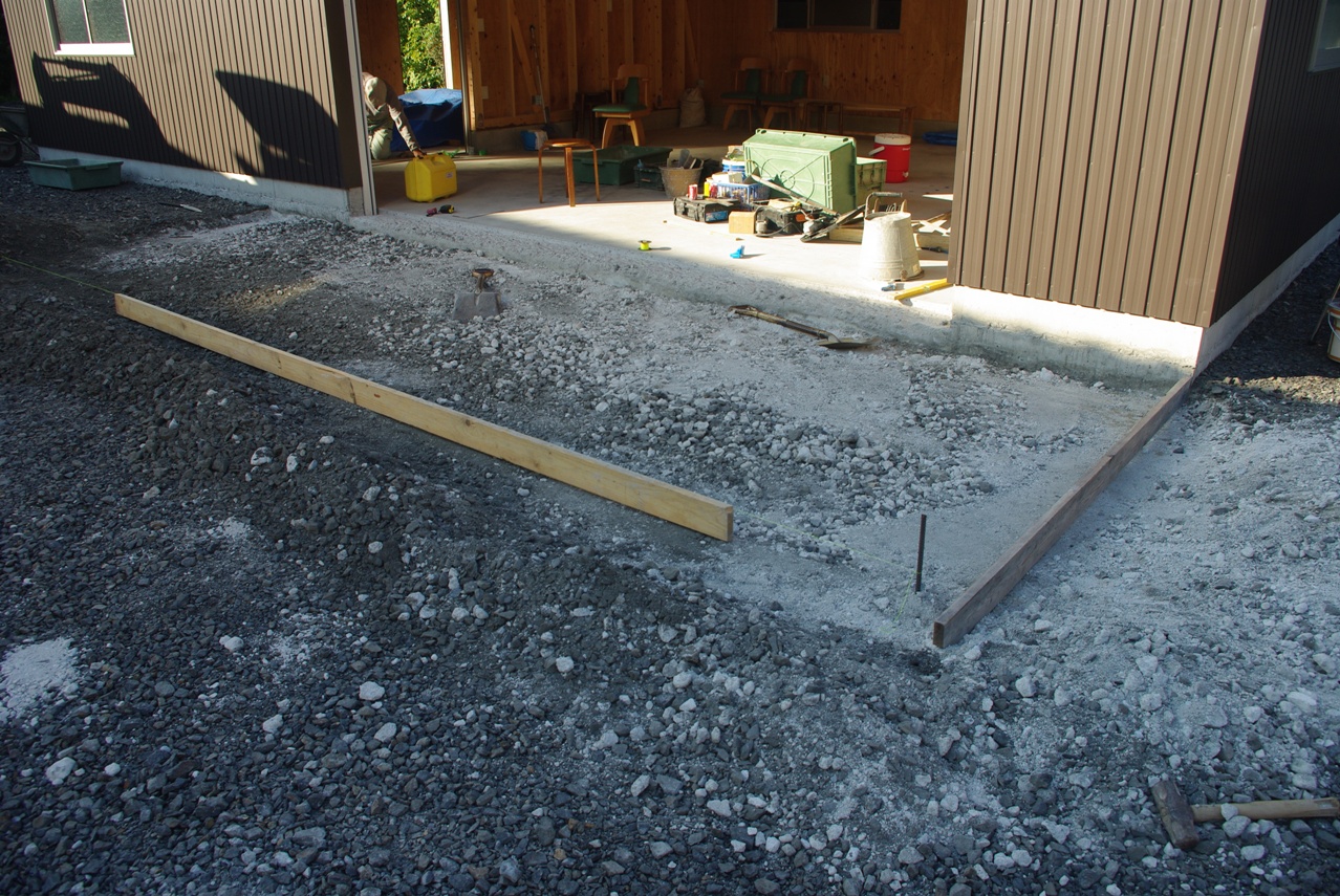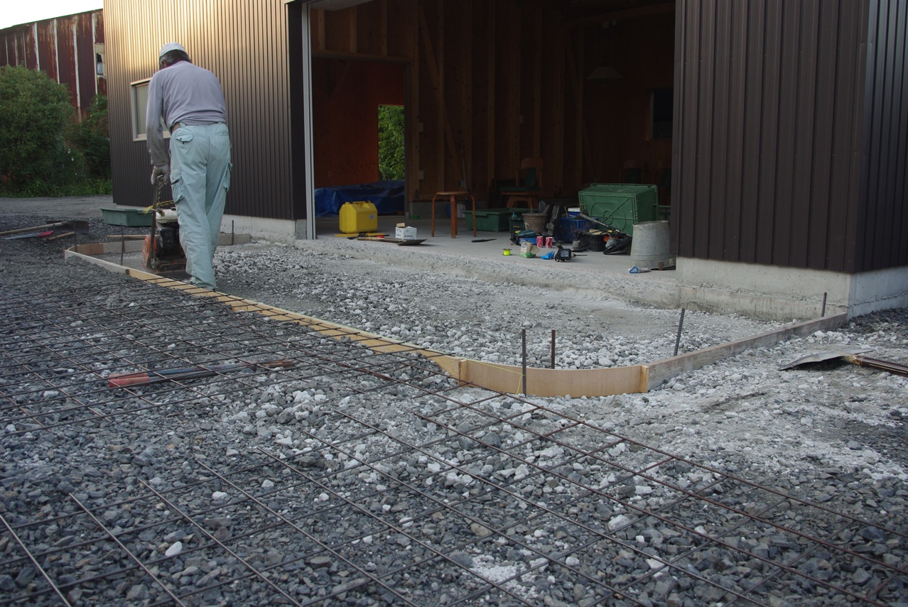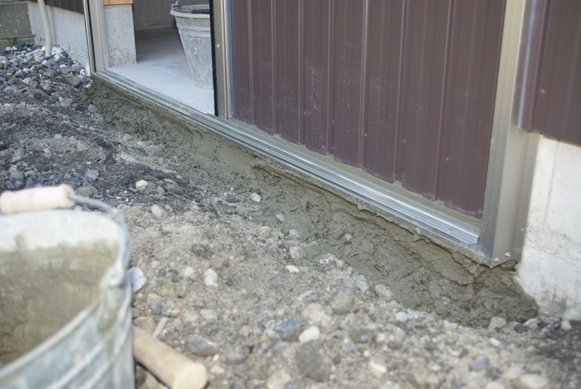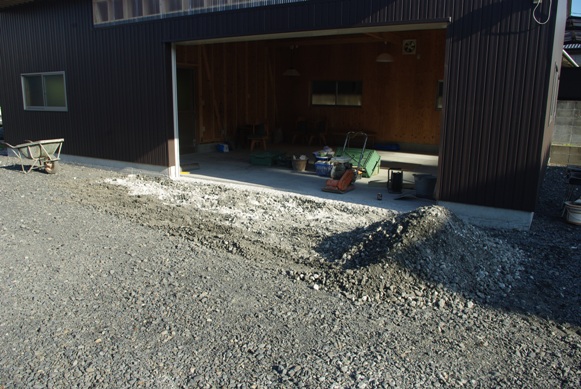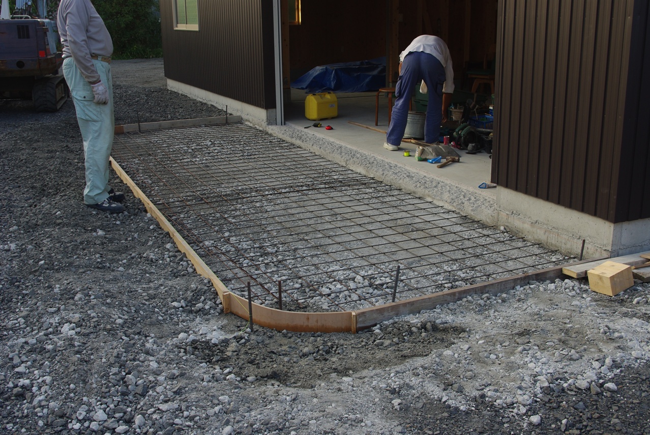 作業とは、倉庫入り口のアルミサッシ枠、間仕切り引き戸のアルミサッシ枠下回りのコンクリートの打ち込みと、ガレージ入り口と倉庫入り口の外構アプローチの設置です。