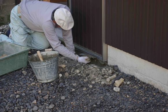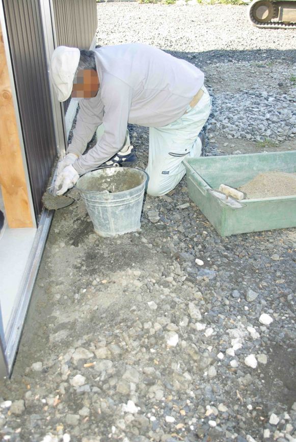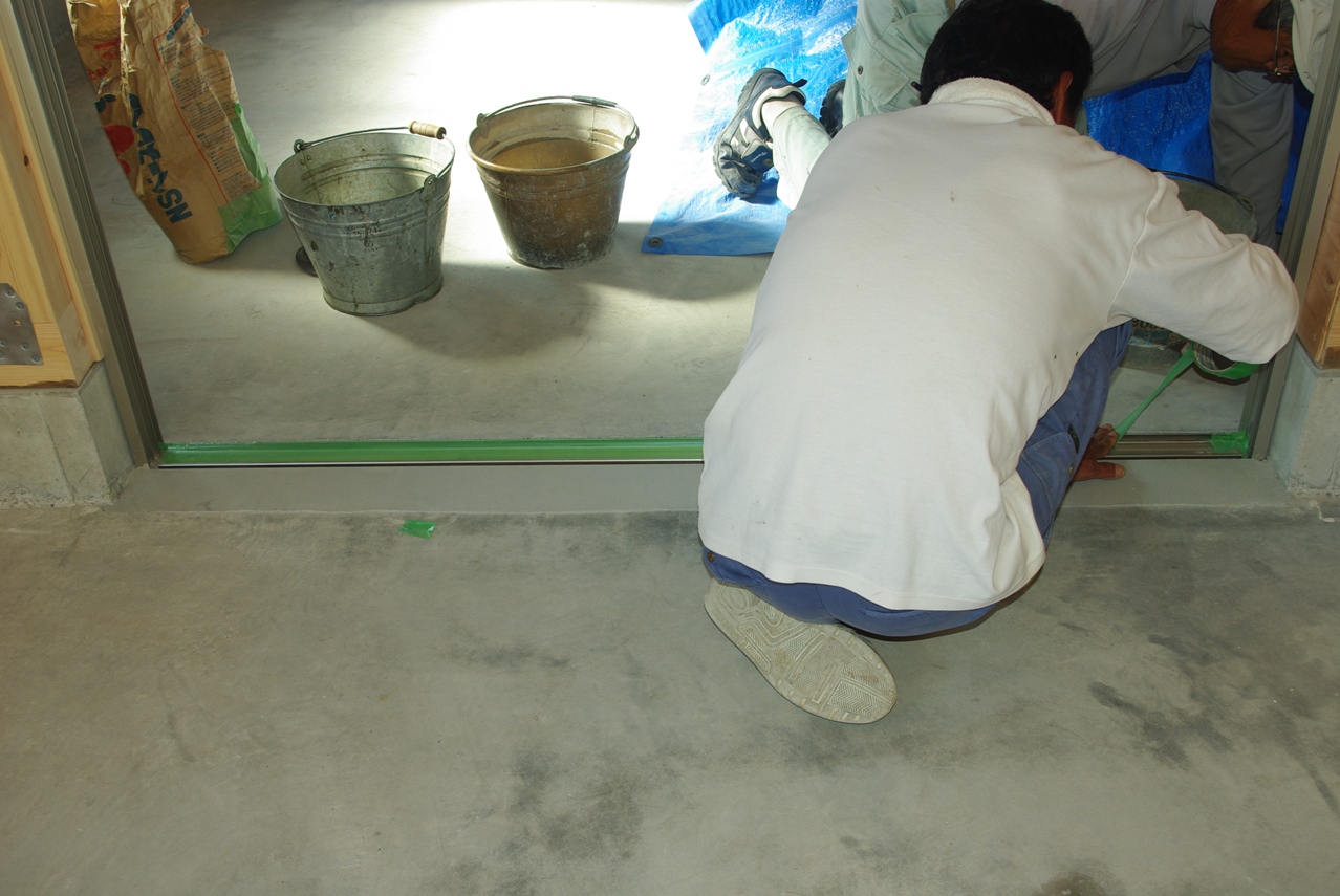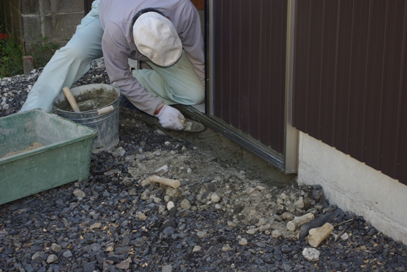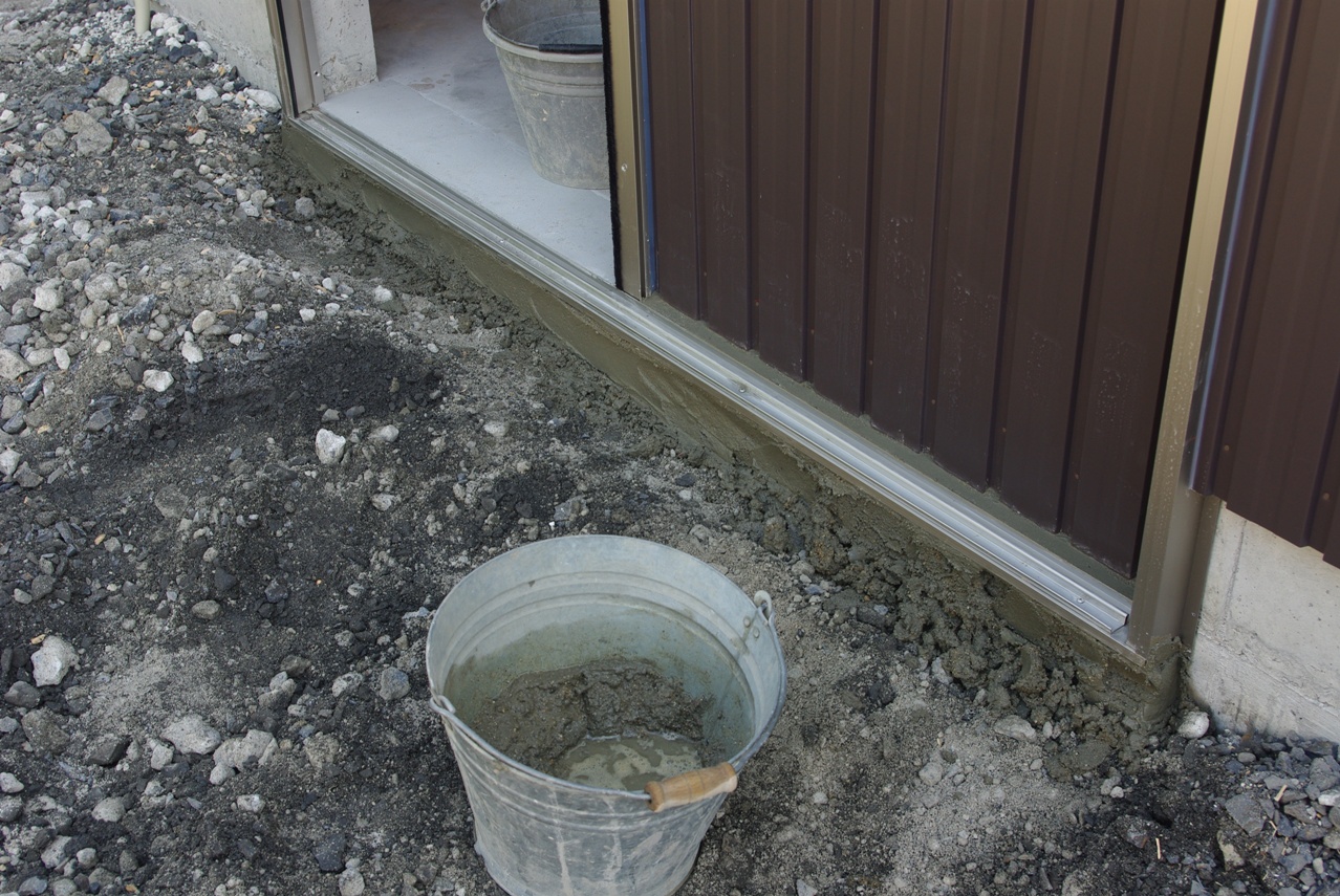 この倉庫入り口では、着々とサッシ下回りにコンクリートを詰め込む作業が行われています。
