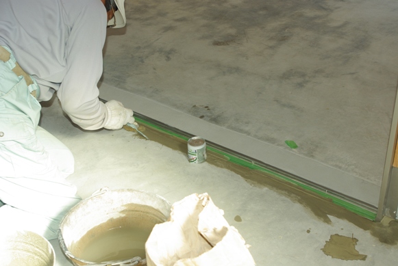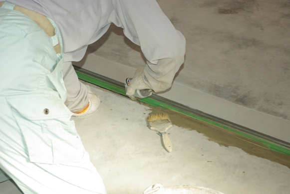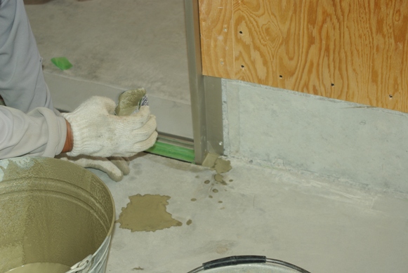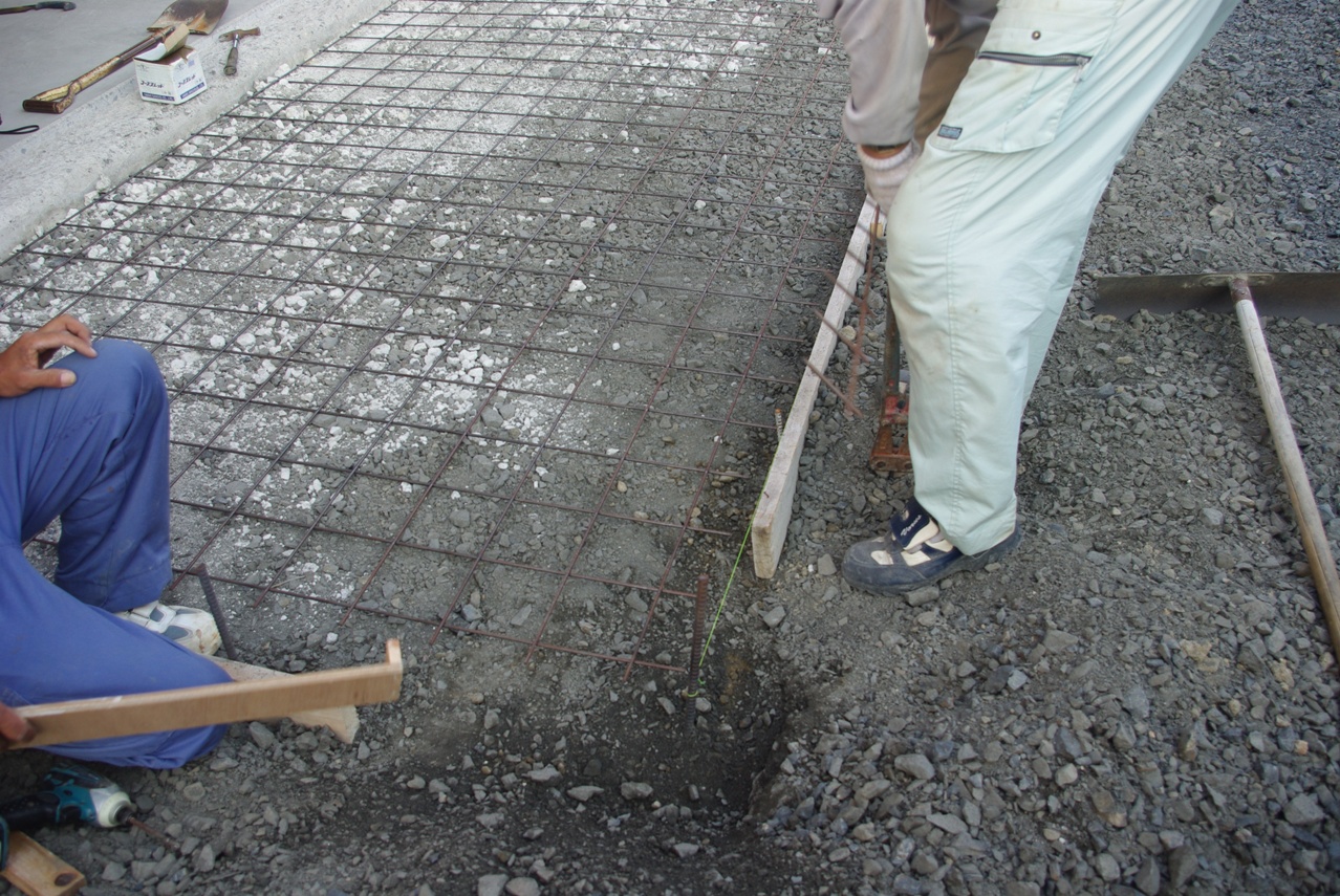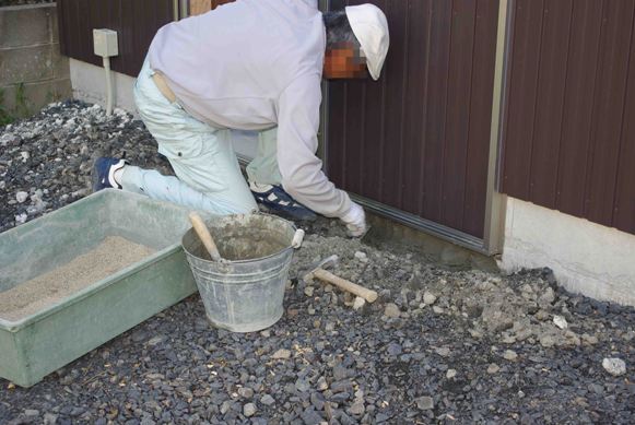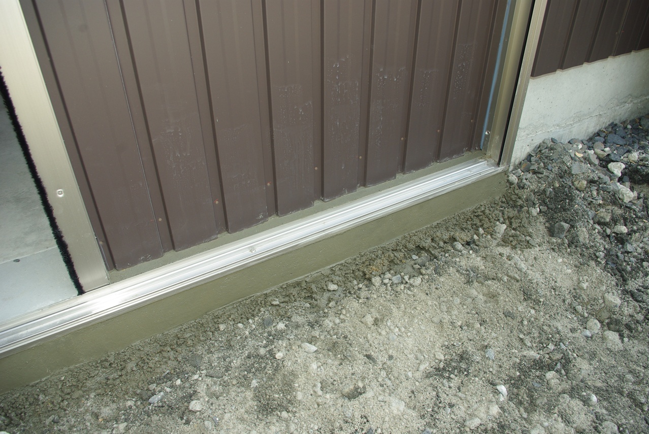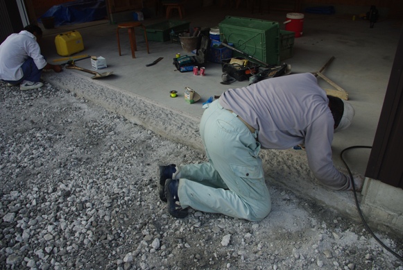 この倉庫入り口では、着々とサッシ下回りにコンクリートを詰め込む作業が行われています。