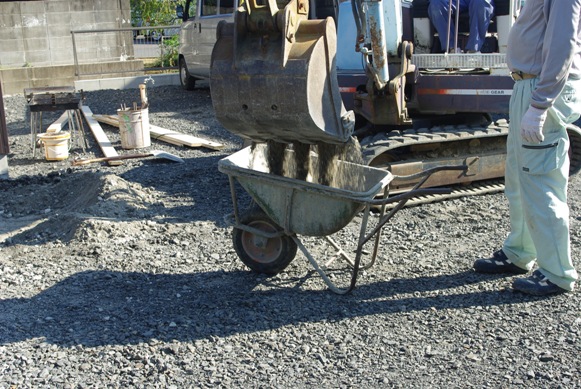 ガレージ入り口で掘り出された土砂を、せっせと建物の裏側に運んでいきます。