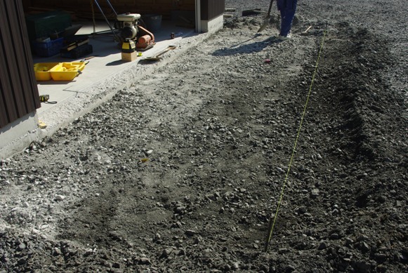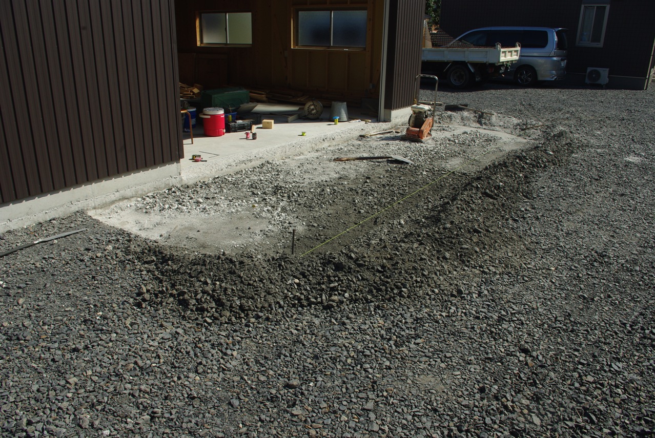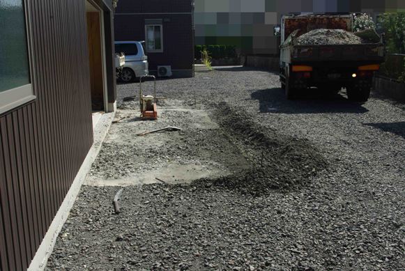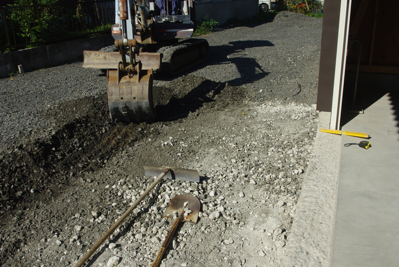 こうしてガレージ入り口の外構アプローチ設置のために、ユンボで浅く地面が掘り返されていました。