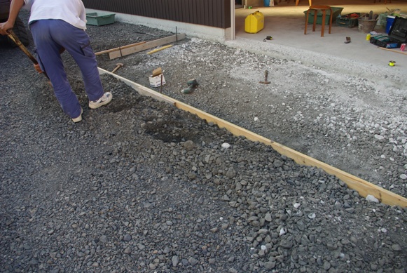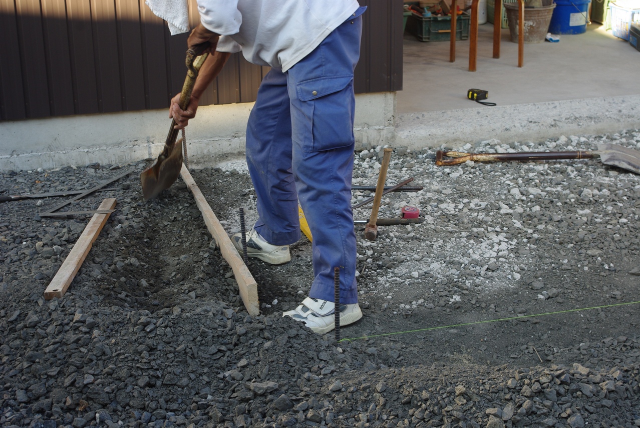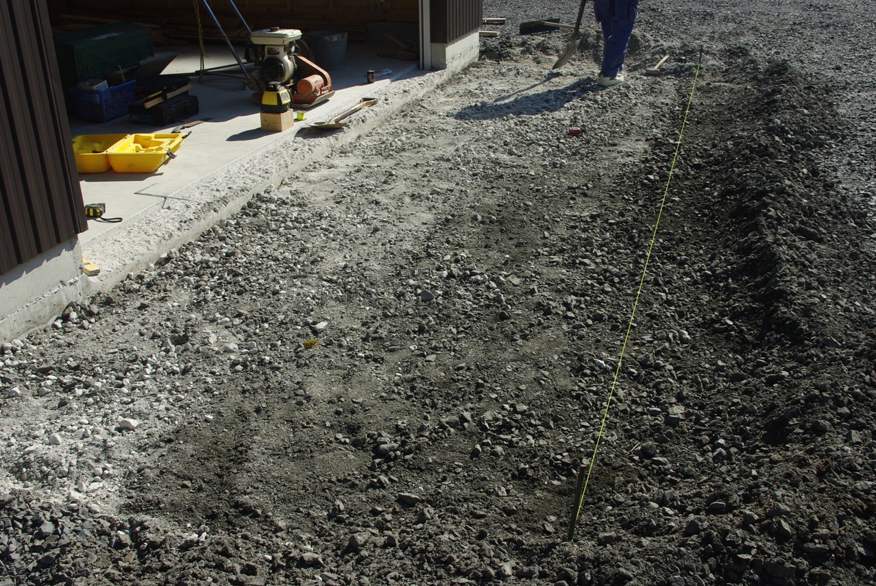 少しづつ表面の砂利土を削って、丁寧に外構アプローチの大きさに窪みを広げていきます。