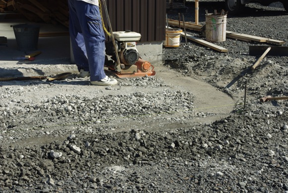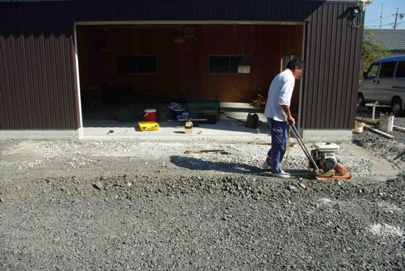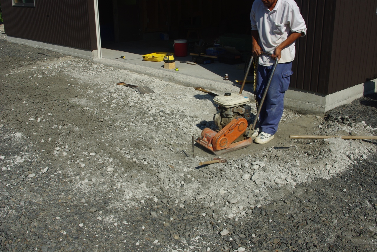 外構アプローチの型枠を設置するため、特に念入りに縁の部分に転圧機をかけていました。