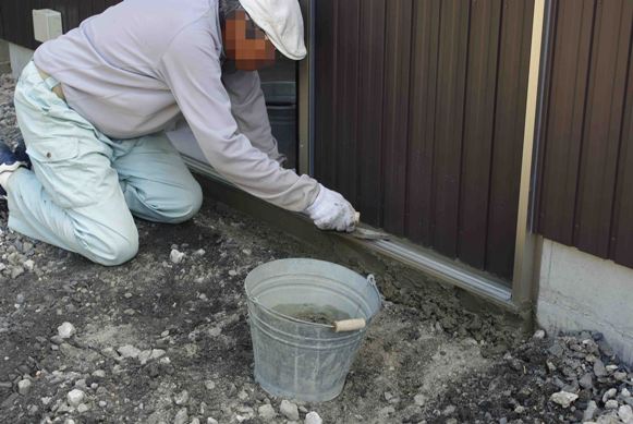 1本引きの戸袋側の外壁とアルミサッシ枠との隙間も、隈無くコンクリートを詰め込んでいます。