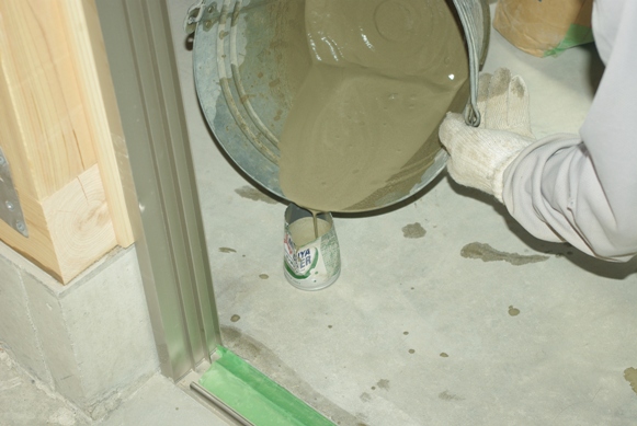 ガレージ西側の敷地の整備の前に、間仕切り引き戸のアルミサッシ枠の下回りの空洞にベースレベラー(モルタル)を流し込む作業を済ませます。