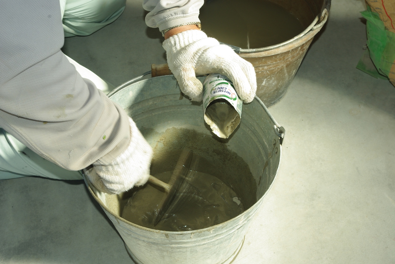 水とセメントと砂の割合は、カンと経験で微妙に配合しながら、必要分を継ぎ足しながら作業を進めます。